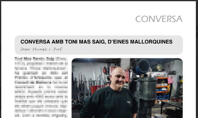 La revista també incorpora les seccions habituals de VISURES, CERCAVILA, SABIES QUE, QUI ÉS QUI, BIBLIODÍNGOLA, CUINAM AMB, OBITUARI… L’entrevista, aquesta vegada, és a Toni Mas Saig, un dels ferrers artesans més coneguts, que fa eines mallorquines.
