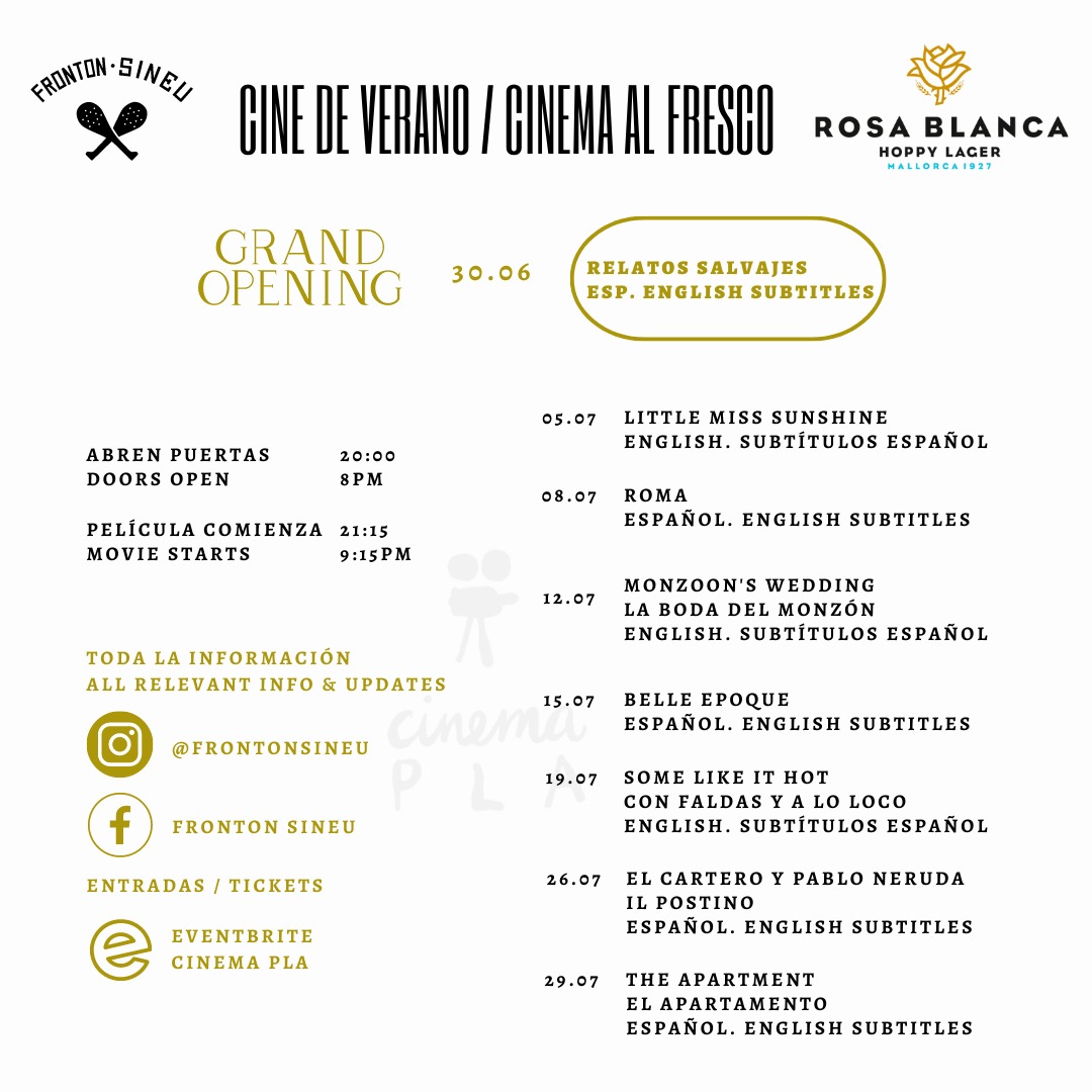 El sus és avui divendres dia 30 amb el film Relatos Salvajes de Damián Szifrón. En aquest cas, el promotor del Frontón, Juan Fernández, dona la possibilitat als assistents a sopar d’un asado argentino en el mateix espai. Per a qui no vulgui sopar, també hi haurà la possibilitat de picar altres menjars més lleugers com a piadinas italianes.