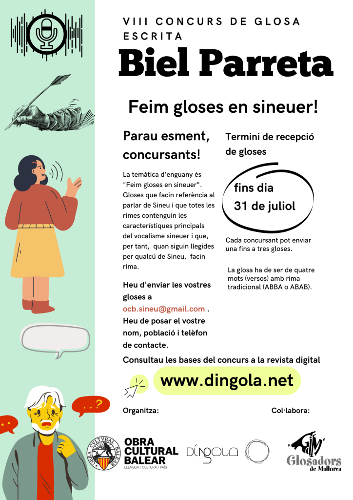 Avui donam el sus a la fase de recepció de gloses de la vuitena edició del concurs de gloses, que organitza OCB-Sineu i Díngola , dedicat al glosador sineuer Gabriel Buades i Real Parreta (1831-1910). Consultau-ne aquí les bases.
