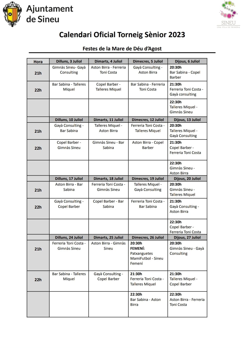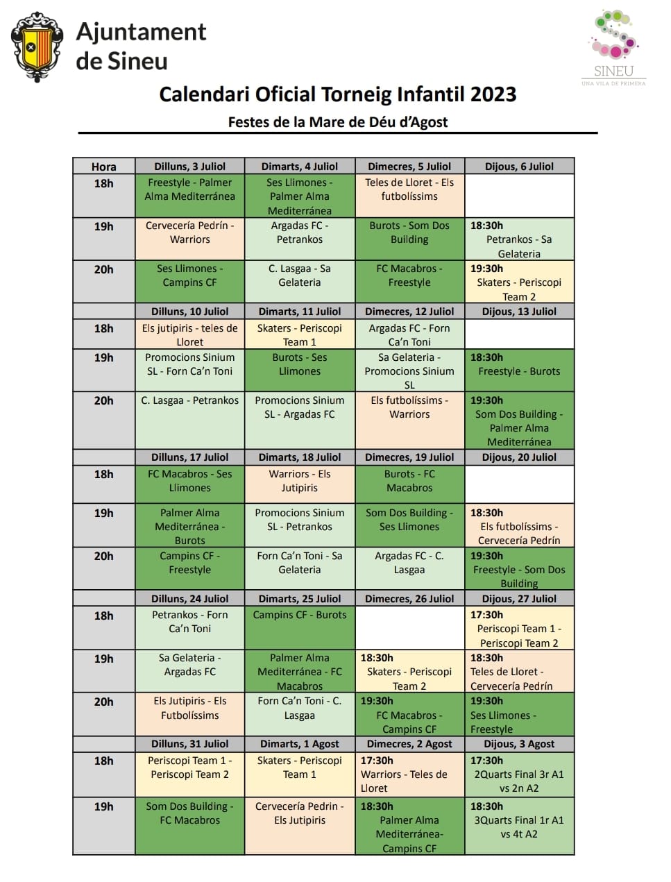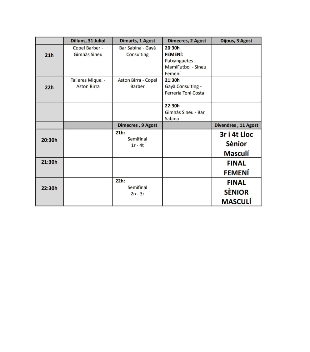 Avui, dilluns, comença el torneig de futbet infantil i sènior de les Festes d’Agost a la pista d’Es Fossar. Ja hi ha una variació a la jornada inaugural ja que el partit infantil de les 18,00 h es disputarà a les 20,00 h, degut a la retirada de l’equip infantil Ses Llimones.