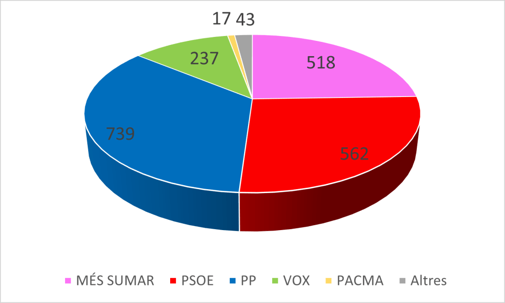 La suma de vots de PSOE i MÉS-Sumar fa 1080 vots. La suma de PP i VOX en fa 976.