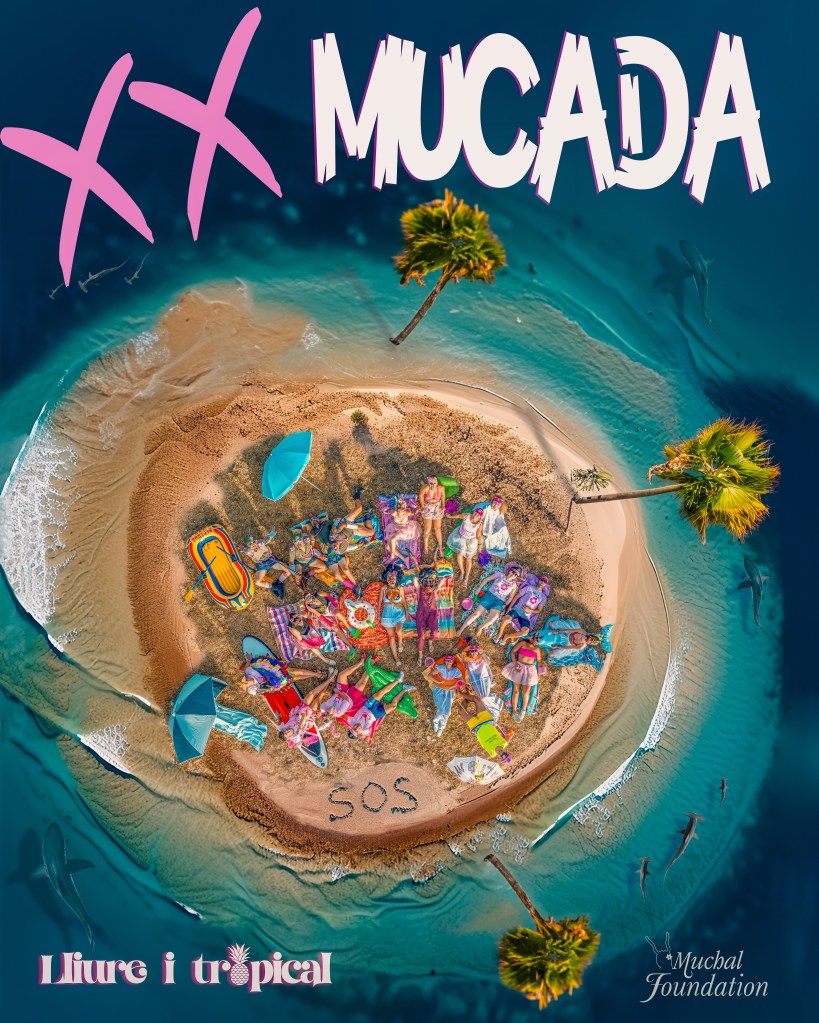 Falten menys de quinze dies per a la festa en honor a lo Much de Reig i la Muca, i ha començat a circular el cartell oficial de la seva vintena edició, un any més obra de Macià Puig-gròs Massay. És, segons explica l’autor, el primer que ha fet servir la intel·ligència artificial, a més d’un dron per a obtenir una imatge zenital. Amb el lema “XX MUCADA lliure i tropical” ens mostra una illa -tropical i lliure-, plena d’uns desinhibits residents en posició d’estar estesos al bater de sol entre els quals destriam diversos components del seguici que, amb devuit sortides en directe i dues en digital (per mor de la pandèmia), tira a tira ha incorporat la processó més atípica de Mallorca; hi veim els integrants de la Germandat de Cavallers Legionaris, membres de la Policia Muquicipal, Manolos de la Prohomonia de Damos d’Honor, confrares dels Donants de Suc, una Egua Fufa, l’Àguila Imperial de Pol·lèntia, el timbaler del Much, confrares de la Confraria Bipolar de Ploradores i Animadores… entre els quals Much i Muca se situen al bell mig de l’illot en què s’aprecien els brins de rostoll i els terrossos, tan característics en aquesta època en els paisatges foravilers de Sineu. Així mateix, senyat a l’arena un “SOS” alerta qui veu la imatge des de l’aire; no sabem si clamen perquè qualcú els rescati o perquè se’ls ha acabat el gel.