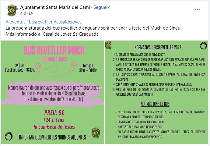 Així, per exemple és simptomàtic que un Casal de Joves organitzi una anada a la festa sortint a les 16:30h. Entre que arriba la gent, cinc minuts per esperar aquell que arriba tard, un tractor a la carretera que circula lent i no hi ha manera d’avançar-lo, i l’embós i controls en arribar a Sineu, arribaran amb s’Enquentro (l’únic acte ‘oficial’ al que encara serien a temps) ja enllestit. Això sí, fins a les dotze no tornen cap al seu poble d’origen, i això que a les 21:30h els bars estan obligats a aturar la música, i a les 22:30h a tancar les barres de l’exterior. Què faran, entre aquest tancament i l’hora de tornada? Botellada? Conclusió: els busos fletats no són per assistir a la Mucada, sinó només a l’akelarre posterior, que conjunta els ingredients essencials (calor, suor, fortor… alcohol, drogues, música…) que fan necessaris més d’un centenar d’efectius per garantir la seguretat dels milers de persones que hi assisteixen (fes clic aquí).