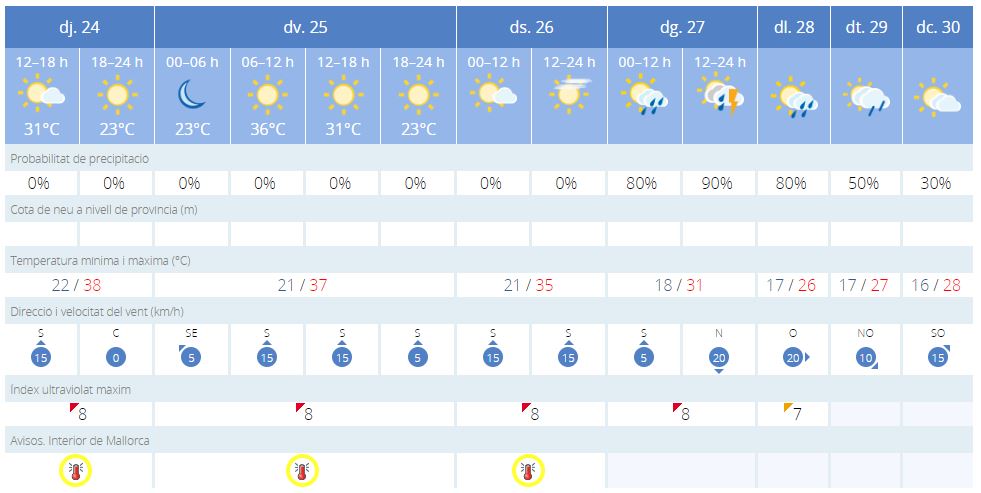 Demà divendres i passat demà dissabte el termòmetre pot acostar-se als 40 ºC al Pla de Mallorca. Però diumenge poden baixar les temperatures (fins a 10 ºC). Aleshores, a partir de diumenge farà calor (30 ºC són calor!) però no aquesta calorota d’ara. Això anirà acompanyat de tronades curtes i intenses, com passa aquesta temporada de l’any.