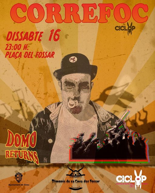 Els Dimonis de sa Cova des Fossar faran un espectacle en el marc del festival de teatre CICLOP, i ompliran de foc la plaça des Fossar. Serà demà dissabte a les 23h a es Fossar. Tot i això, avui ja encalentiran motors, ja que participen a les festes de Sant Cosme i Sant Damià, de Pina. Serà avui a les 22h en els carrers del centre del poble.