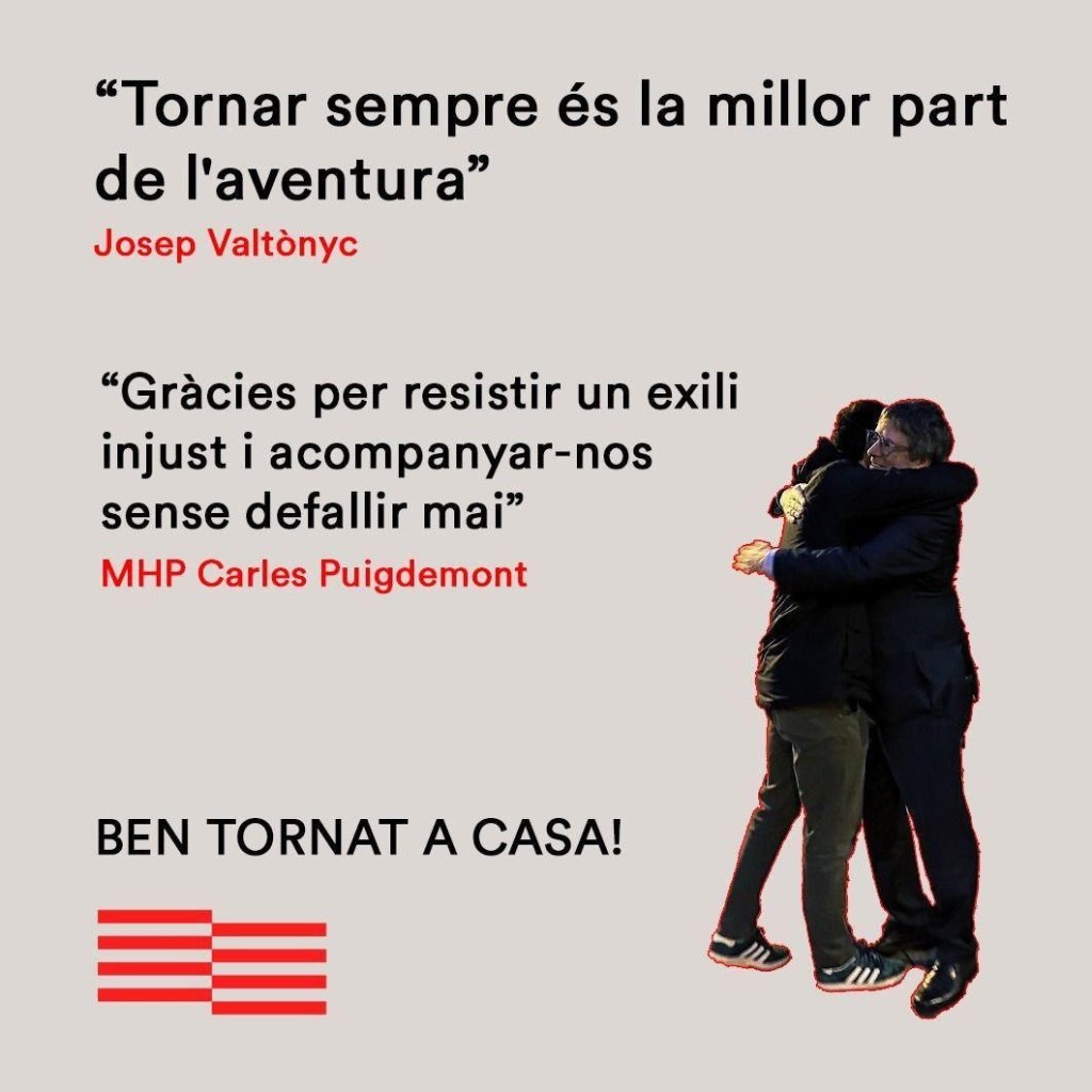 Arenas ha declarat a través de les xarxes que «Tornar sempre és la millor part de l’aventura. Gràcies per haver-me acompanyat durant aquests 6 anys d’exili i ara també en aquest primer trajecte de tornada a casa. Per tot el que hem lluitat, rigut, viscut i plorat. Gràcies, President Carles Puigdemont».