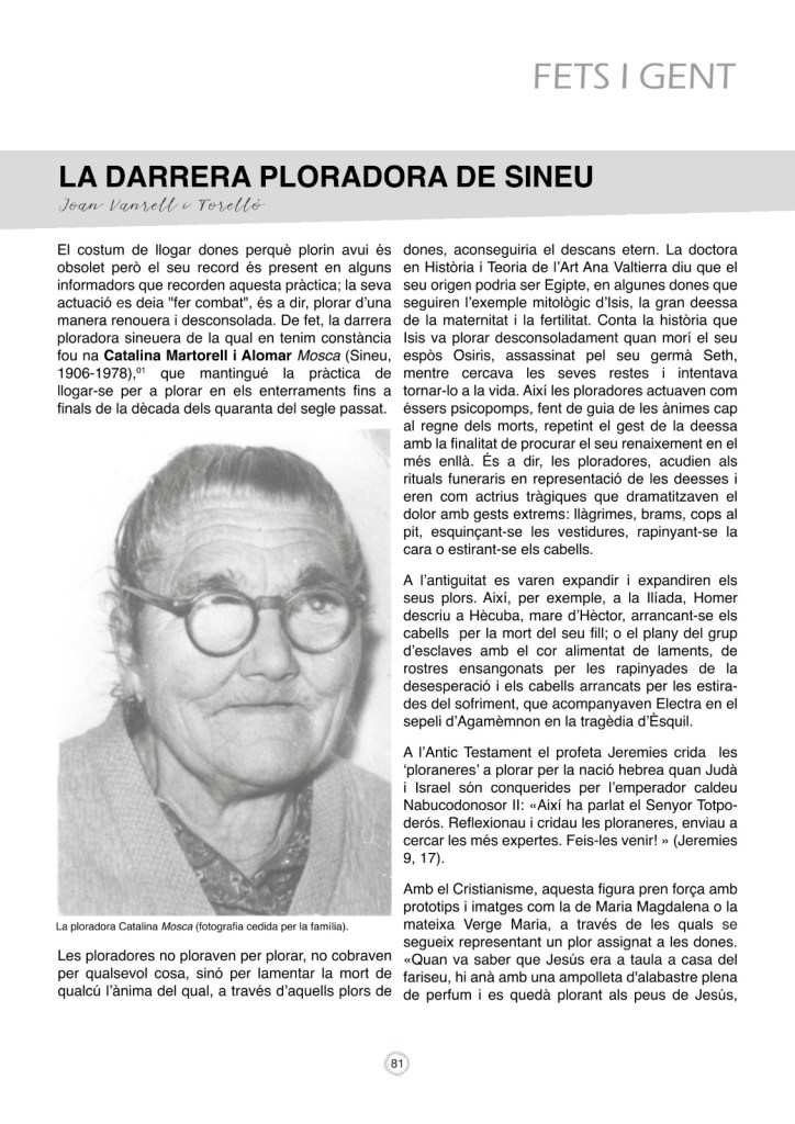 “La darrera ploradora de Sineu“, del nostre company de redacció Joan Vanrell, recorda la figura de Catalina Martorell i Alomar Mosca (Sineu, 1906 – 1978), que mantingué la pràctica de llogar-se per a plorar -fer combat, plorar d’una manera renouera i desconsolada- en els enterraments fins a finals de la dècada dels quaranta del segle passat.