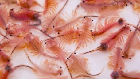 Un altre dels aliments dels flamencs és un petit crustaci que viu a les aigües salobres -salines i llacs salats- el seu nom científic és Artemia salina. Es tracta d’un organisme d’origen molt antic, amb característiques particulars, entre les quals la natació amb el cos invertit i la capacitat per produir ous perdurables que poden aguantar llargs períodes de sequera. La ingesta de l’alga Dunaliella, de la qual absorbeix el ß carotè, li dona el color vermell rosat, el qual realitza la mateixa funció protectora contra l’excés de radiació. Artemia té un sistema de regulació de la pressió osmòtica molt eficient, basat en la eliminació de la sal i en la protecció de l’interior del cos amb un tegument impermeable.