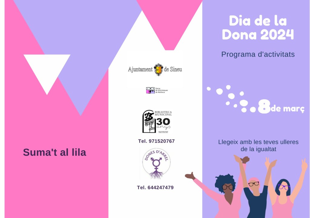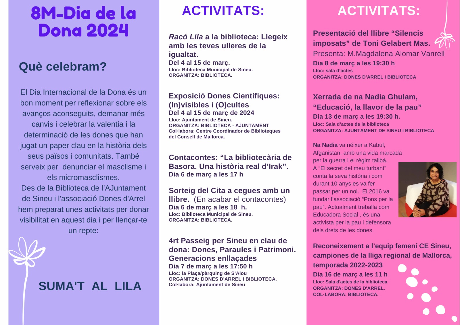 La Biblioteca ha publicat un tríptic que recull els actes amb la col·laboració de l’Ajuntament i Dones d’Arrel. A més del Racó Lila, contacontes, cita a cegues amb un llibre i la presentació del llibre Silencis imposats a la Biblioteca, també hi haurà l’exposició Dones Científiques: (In)visibles i (O)cultes, i la xerrada de l’activista afganesa Nadia Ghulam. Amb Dones d’Arrel han organitzat el quart Passeig per Sineu en clau de dona i un reconeixement a l’equip femení de futbol del Sineu, campiones de lliga 2022-23.