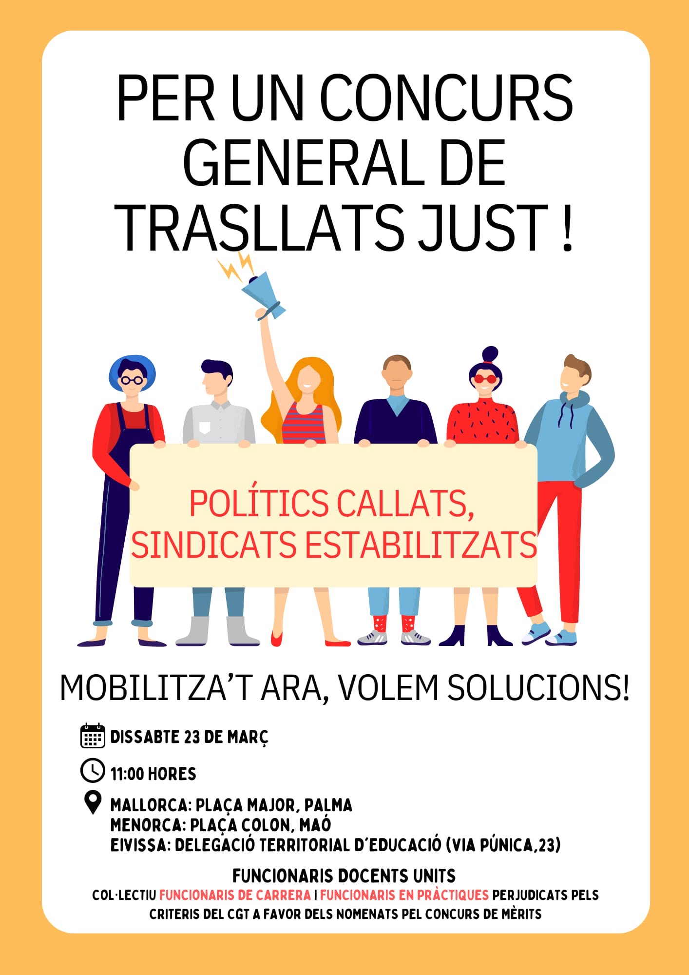 Aquest col·lectiu de funcionaris en pràctiques ja ha fet mobilitzacions i avui dissabte en fan novament a Palma, a Maó i a Vila. Volen visibilitzar la injustícia que s’ha comès amb ells i alhora reclamar que al manco les comissions de servei sí que els afavoreixein i puguin tenir accés a places a Mallorca que quedin vacants per jubilacions i similars.