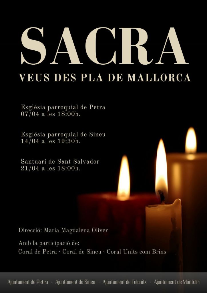 La proposta musical SACRA, després d’un primer concert realitzat el passat diumenge a l’església parroquial de Petra, arriba a Sineu amb un concert de música polifònica el proper diumenge, 14 d’abril, a les 19.30 h a l’església parroquial i és d’entrada lliure. El tercer, i darrer, concert del cicle serà el diumenge 21 al Santuari de Sant Salvador de Felanitx.