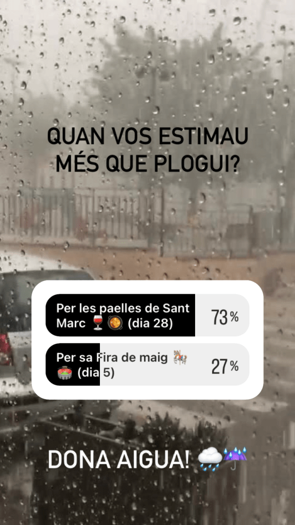 En un sondeig de DíNGOLA a través d’Instagram, el 73% dels votants s’estimava més que, si plovia, ho fes per les paelles de Sant Marc, i només un 27% que ho fes per sa Fira.
