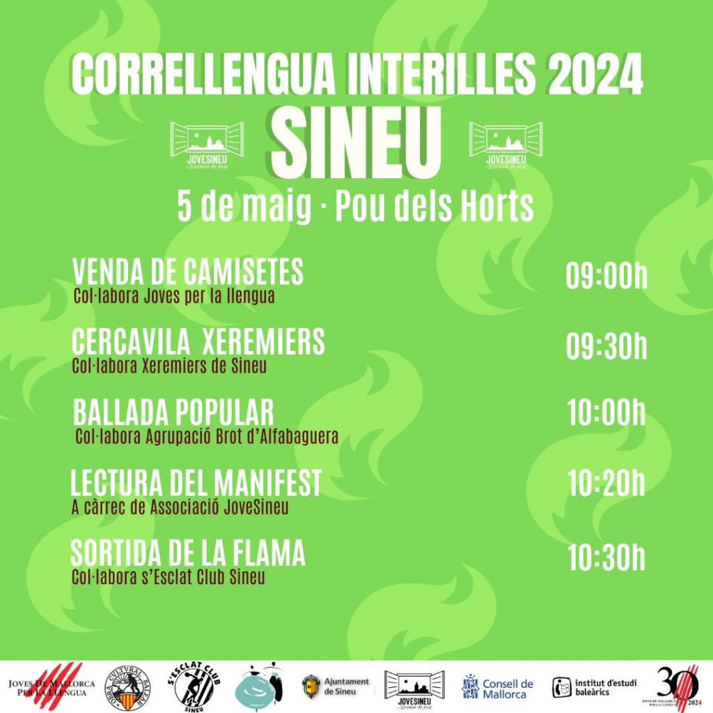 El Correllengua passarà el diumenge matí per Sineu, coincidint amb la Fira. Enguany compta amb l’organització de l’associació JoveSineu i la col·laboració de la delegació local de l’OCB i Díngola, l’Ajuntament i el Club local d’atletisme s’Esclat Club Sineu.