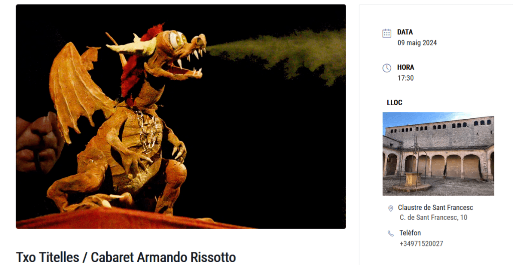 La 26a edició del Festival Internacional de Teatre de Teresetes de Mallorca tornarà tenir Sineu com un dels seus llocs de representació. Serà aquest dijous, dia 9, al Claustre de l’Ajuntament a les 17,30 h, amb l’obra Sinopsis del grup català Txo Titelles / Cabaret Armando Rissotto.