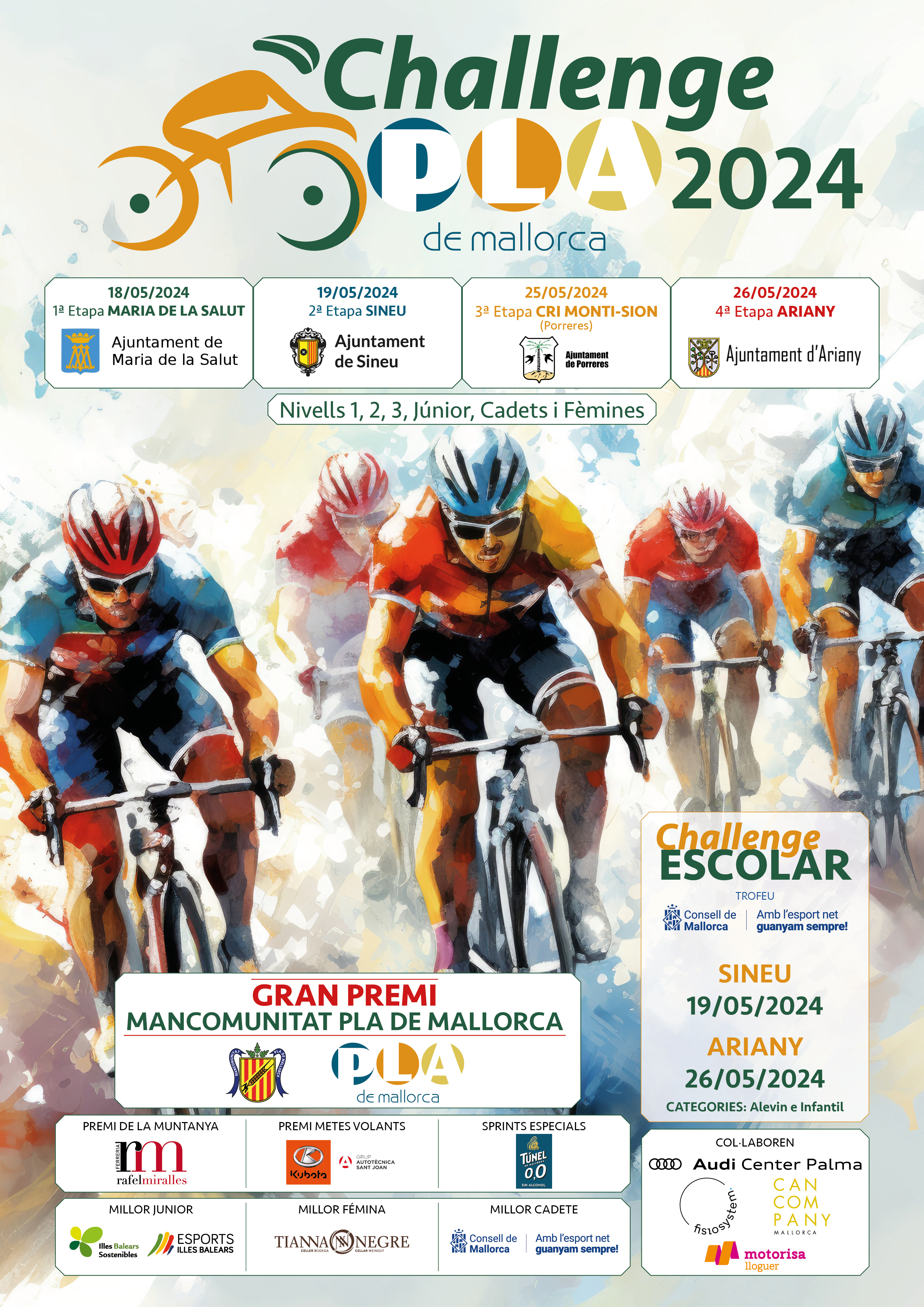 Una novetat és que també hi haurà dues proves de Challenge escolar Pla de Mallorca per a les categories aleví i infantil. El recorregut serà un circuit urbà, dia 19 a Sineu i dia 26 a Ariany.