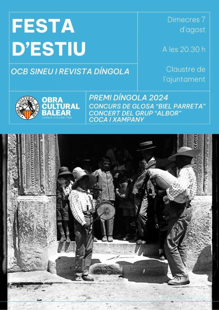 La delegació de Sineu de l’Obra Cultural Balear i Díngola hi participam amb la col·laboració al concert “Xerefusió” de Xeremiers de Sineu i amics (que també es va celebrar ahir vespre) i la ja clàssica Festa d’Estiu, que farem el proper dimecres dia 7, a les 20.30 h; tots hi estau ben convidats. Dijous dia 8, podeu acompanyar els infants a partir de les 18.30 h al claustre de l’ajuntament on hi haurà el Taller Mucal de les llanternes, els convidarem a fer un gelat i recorrerem el centre del poble amb la processó del ‘Sereno ha mort un moix’ per a deixar els fanals a punt d’honorar lo Much de Reig i la Muca amb els paramuquis (acte conjunt amb la Biblioteca de Sineu i la Confraria Muchal Foundation).