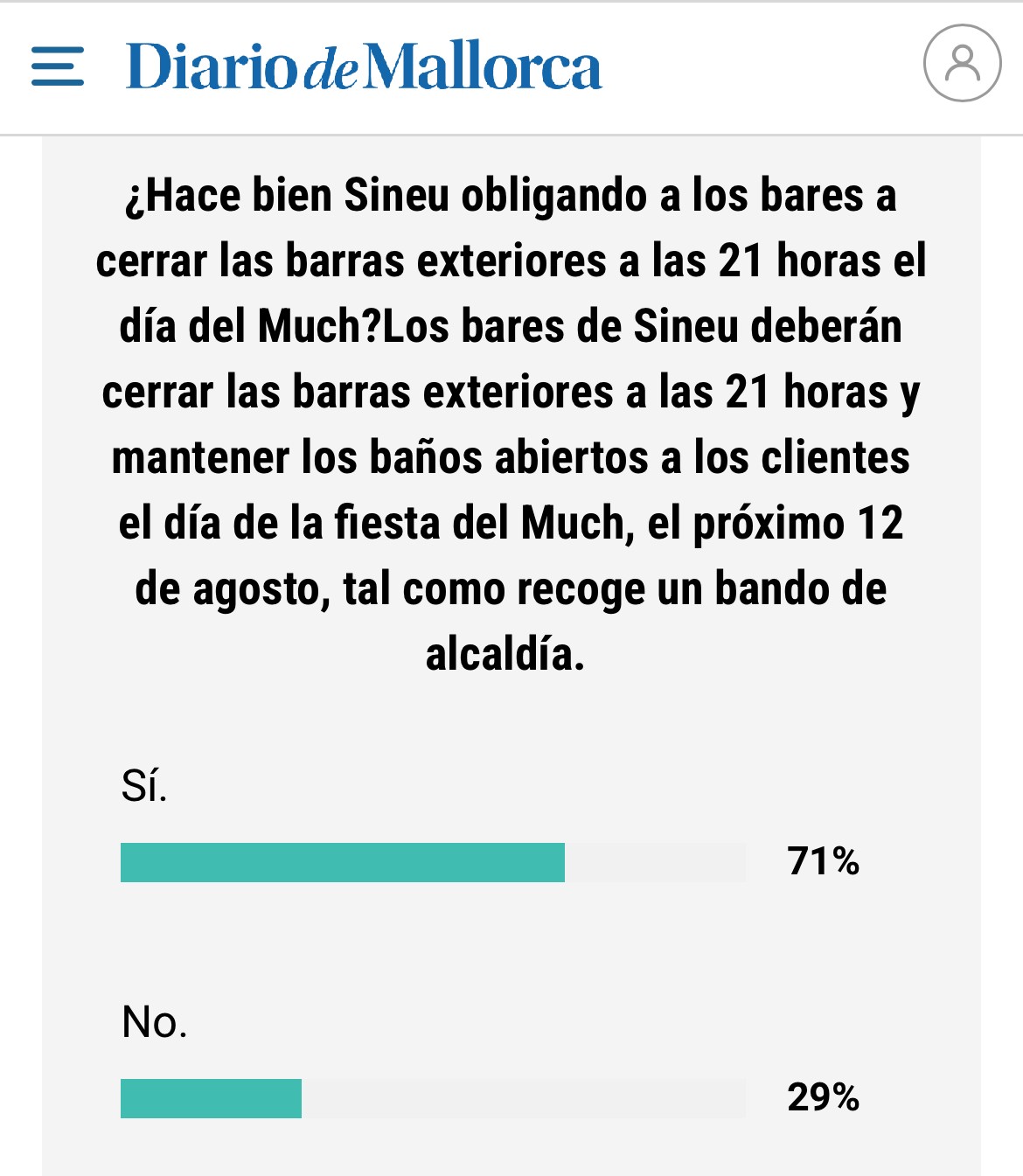Enquesta de Diario de Mallorca. El passat diumenge el Diario de Mallorca publicava els resultats d’una enquesta que va fer: 7 de cada 10 lectors del diari estan a favor de les mesures restrictives establertes per preservar la Mucada. Recordem que moltes de les mesures són les que s’han aplicat altres anys, amb PP o amb Gent per Sineu al govern. La Muchal Foundation sempre ha dit que s’havien de posar restriccions per evitar convertir la Mucada en una macrodiscoteca o una macrobotellada. Enguany s’ha implementat alguna mesura addicional, que no ha agradat a tots. Avui Mulet ha dit a DíNGOLA que «tots els que col·laboren amb la festa tendran sempre el meu suport» i ha agraït la «tasca i comprensió de tots els que treballen perquè la Mucada es desenvolupi correctament».