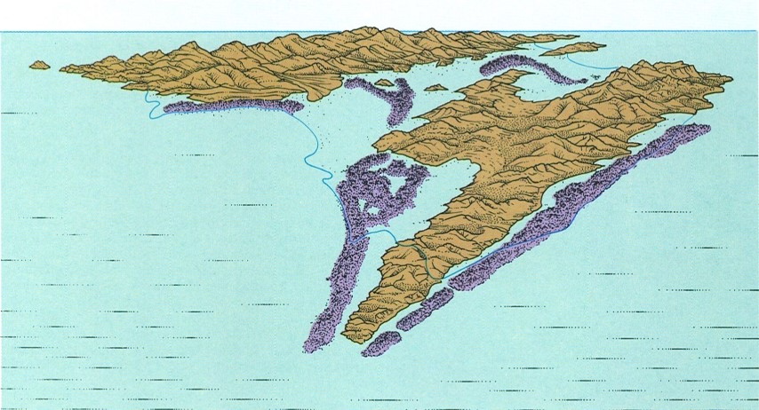 En color marró hi ha la terra emergida i en blau la zona ocupada per un mar som, de poca profunditat, i en color lila esculls de corall.