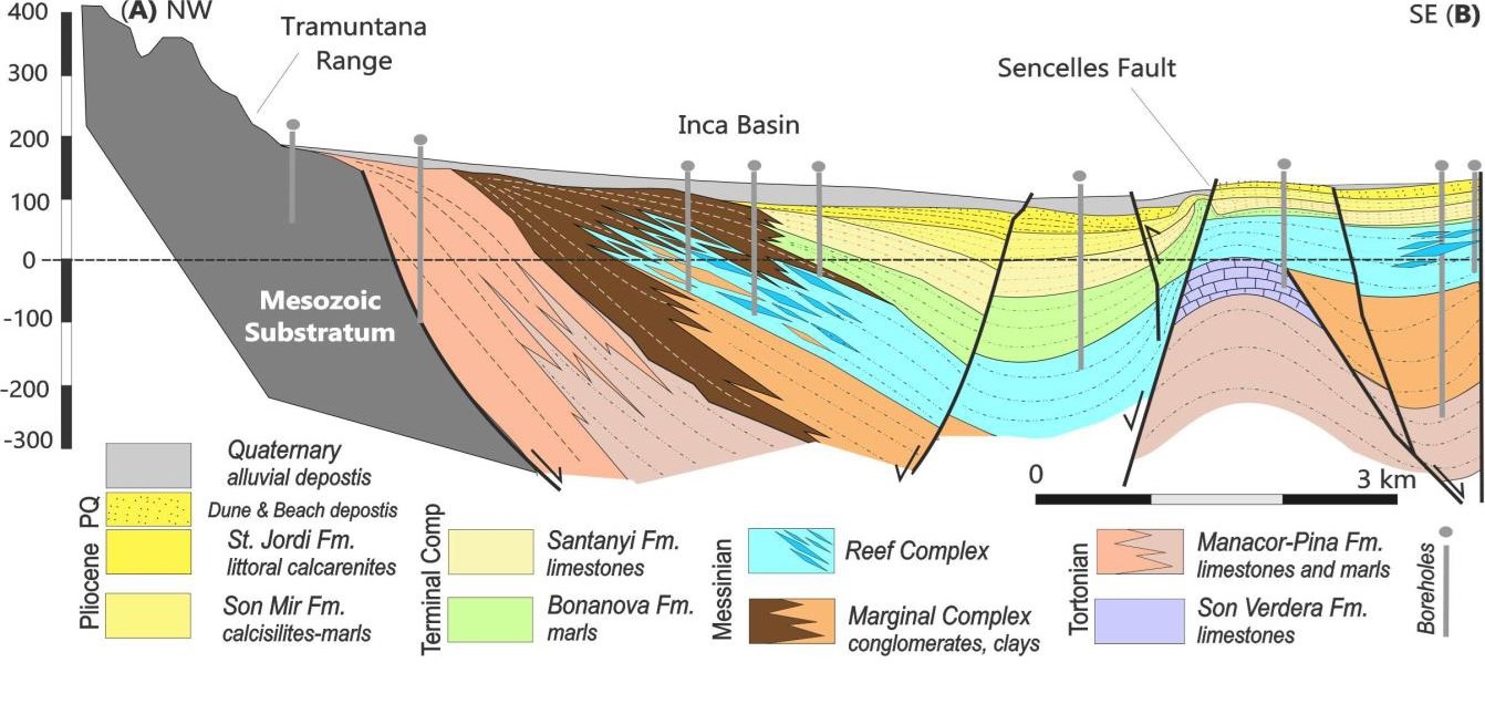 L’estructura que mostra la figura 3, roques majoritàriament impermeables, oligocenes o del miocè inferior a la base, i a damunt calcàries recifals, permeables, per la dimensió que té i per la disposició geomètrica fa que sigui un dels aqüífers més grans de Mallorca.
