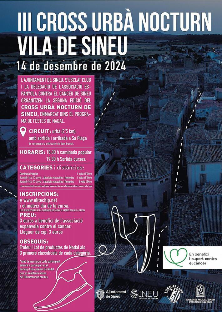 Dissabte, dia 14 de desembre, es celebrarà la tercera edició del cros urbà nocturn a Sineu, una cursa solidària organitzada per l’Ajuntament de Sineu, s’Esclat Club i la delegació de l’Associació Espanyola contra el Càncer de Sineu. La cursa s’enmarca dins el programa de festes de Nadal.