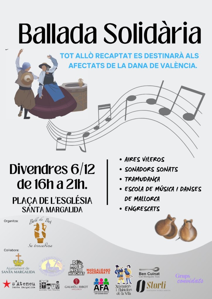 El passat divendres, dia 6, el grup de ball de bot Sa Trencadissa de Santa Margalida va organitzar una ballada solidària per a recaptar doblers per ajudar als pobles del País Valencià afectats per la DANA. En aquesta ballada hi estava convidat el grup Brot d’Alfabeguera de Sineu però no hi va poder assistir per problemes d’agenda.