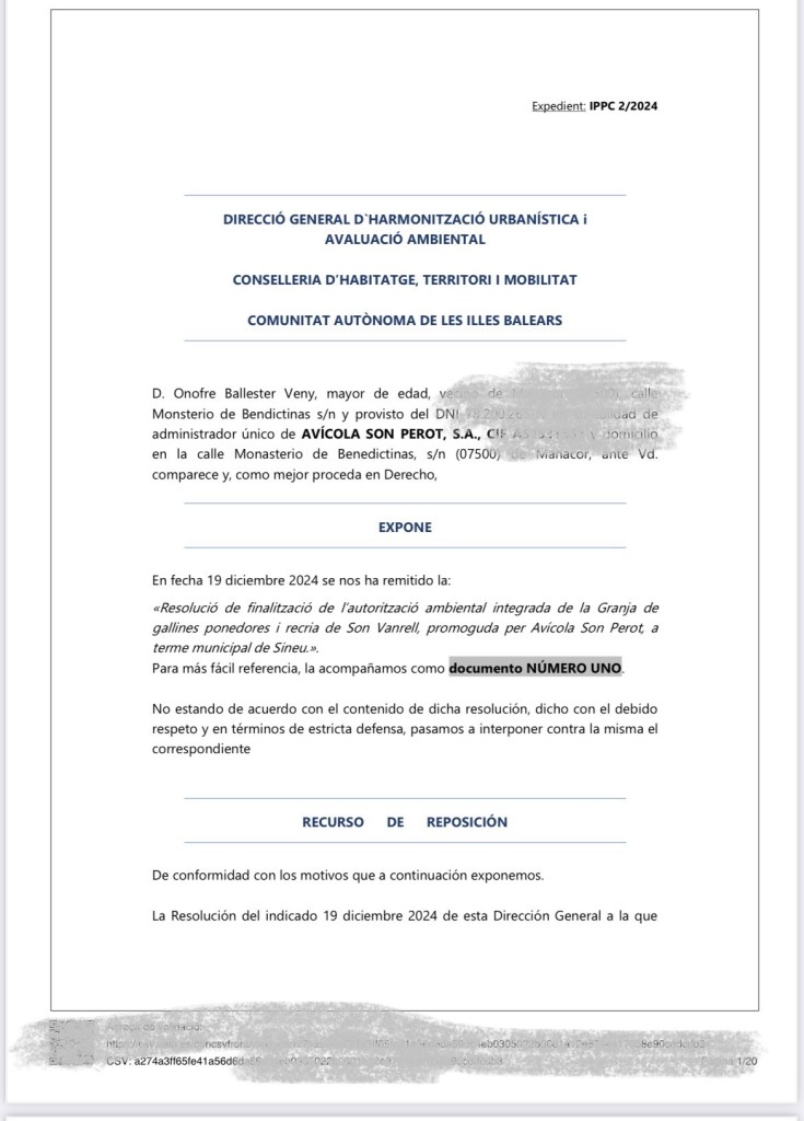 Avícola Son Perot ha presentat un recurs de reposició davant la Conselleria d’Habitatge, Territori i Mobilitat en contra de la finalització de l’expedient per obtenir la declaració mediambiental integrada.