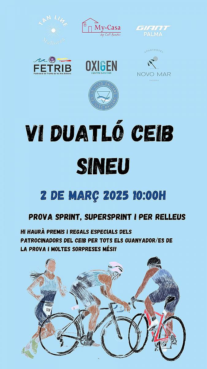 La Federació de Triatló de les Illes Balears juntament amb l’Ajuntament de Sineu organitza aquesta sisena edició del Duatló de Sineu. Serà el diumenge matí.