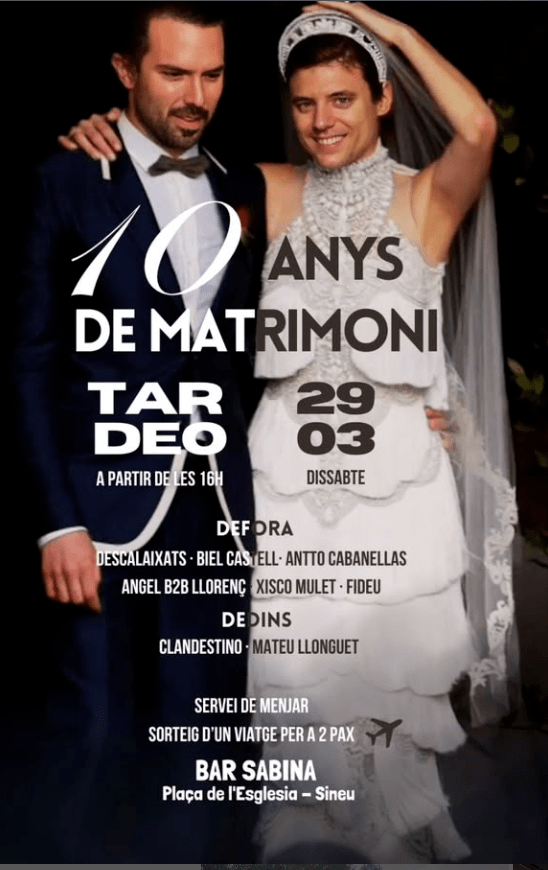 Una horabauxa celebrarà demà els 10 anys de socis de Xema Matamales i Llorenç Gelabert. Durant aquests anys han regentat Son Cleda, s’Índic i, des de fa uns anys, el Sabina. Per anunciar l’esdeveniment, han fet uns cartells ben originals, convidant a la “celebració matrimonial”. L’horabauxa comptarà dos escenaris, un dins el Bar Sabina, amb l’actuació de Mateu Llonguet i Clandestino, i un a fora, enmig de sa Plaça, amb Descalaixats, Àngel Jurado, Fideu, Xisco Mulet, Descalaixats, Anto Cabanellas i Biel Castell. Hi haurà servei de menjar, i es sortejarà un viatge.