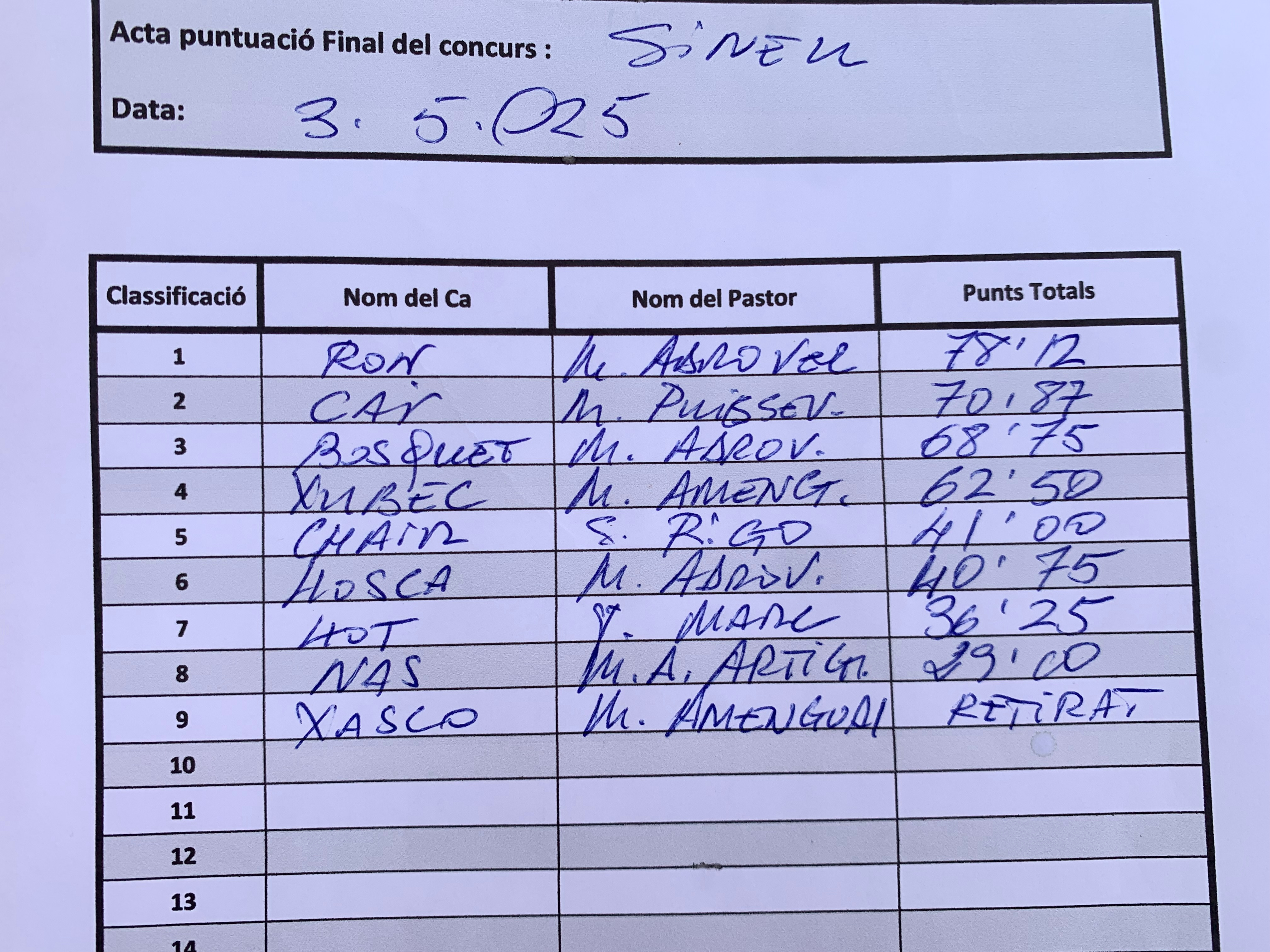 A continuació, adjuntam la taula classificatòria remesa per l’Associació de Concursos de Cans Pastor de les Illes Balears: