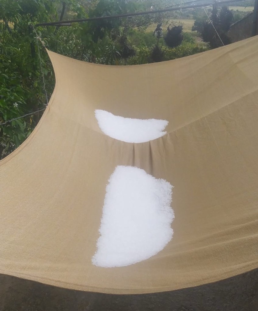 Així ha quedat el tendal d’un porxo a Son Tei. Ple de gel. Molts vehicles s’han vist sorpresos pel temps fa unes hores, i alguns s’han desviat cap a dins el poble o han cercat aixopluc davall el cobert de la benzinera de Shell, a la carretera d’Ariany.