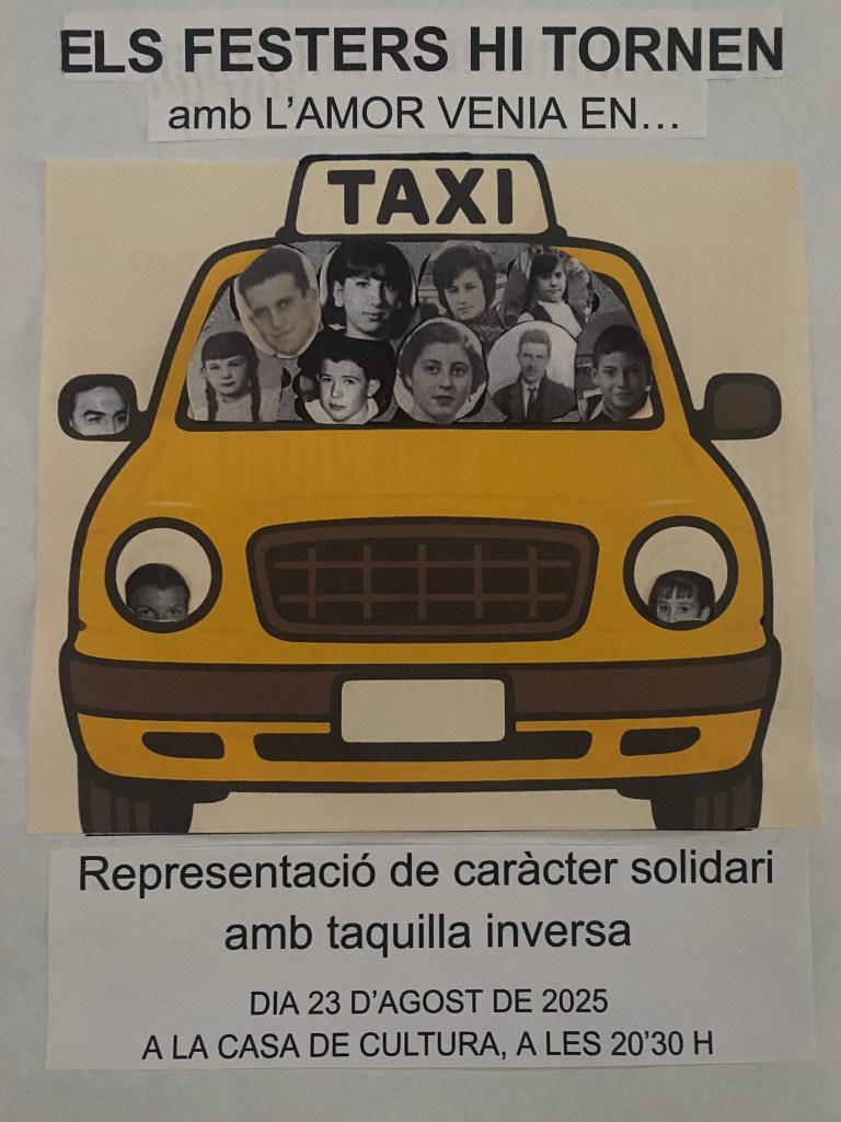 El grup de teatre Els Festers (de la 3a edat) representarà L’amor venia en taxi amb caràcter solidari aquest proper dissabte, dia 23 d’agost, a la sala d’actes de la Casa de Cultura a les 20’30h.