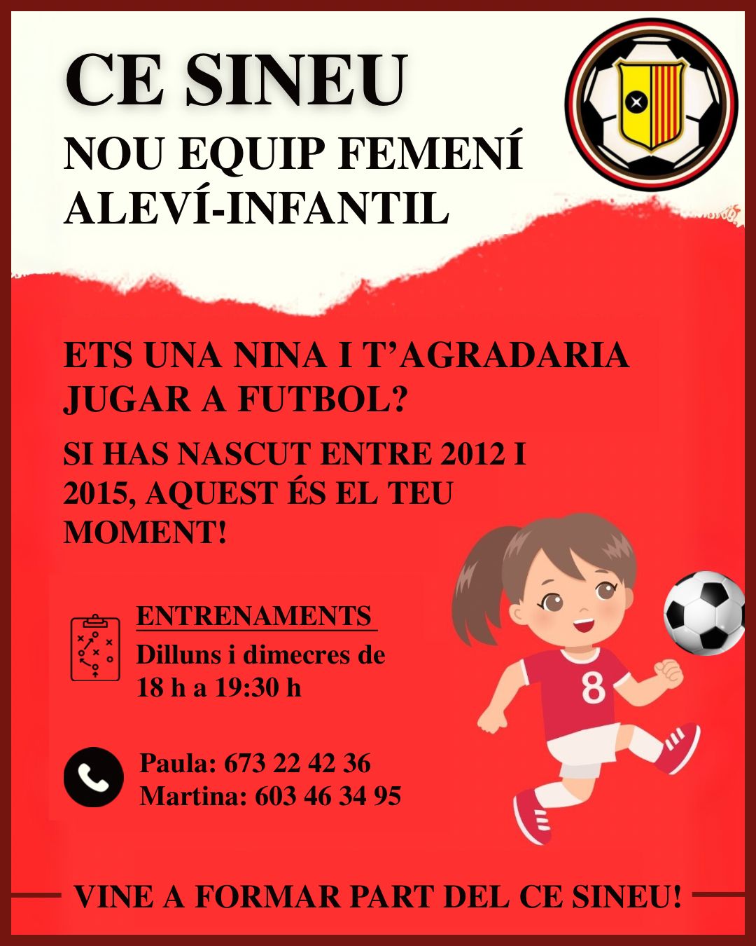 El C.E. Sineu cerca jugadores en edat aleví-infantil per a fer un nou equip. De fet, el nou femení aleví-infantil ja ha començat els entrenaments. El club fa una crida per a que més jugadores s’animin a provar l’esport del futbol.