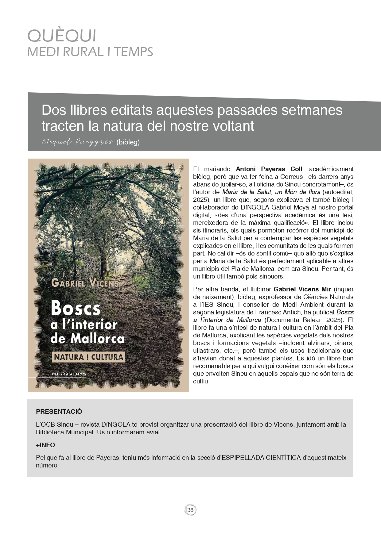 El llubiner Gabriel Vicens Mir (inquer de naixement), biòleg, exprofessor de Ciències Naturals a l’IES Sineu, i conseller de Medi Ambient durant la segona legislatura de Francesc Antich, ha publicat Boscs a l’interior de Mallorca (Documenta Balear, 2025), el llibre que es presenta divendres. El llibre fa una síntesi de natura i cultura en l’àmbit del Pla de Mallorca, explicant les espècies vegetals dels nostres boscs i formacions vegetals –incloent alzinars, pinars, ullastrars, etc.–, però també els usos tradicionals que s’havien donat a aquestes plantes. És idò un llibre ben recomanable per a qui vulgui conèixer com són els boscs que envolten Sineu en aquells espais que no són terra de cultiu, i també per aquells que volen conèixer tot allò associat a la cultura de les plantes silvestres del nostre entorn: per què tenen el nom que tenen, per a quines funcions han estat emprades (medicinals, gastronòmiques, per fabricar utensilis, mobles, etc.), i fins i tot quines dites, cançons o gloses que xerren d’aquestes plantes son habituals en les nostres contrades.