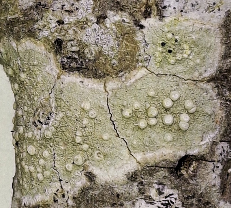 6.- Liquen del gènere Lecanora, els marges lobulars són característics d’aquest liquen, els punt obscurs són els apotecis, on és produeixen les espores per a la reproducció sexual.