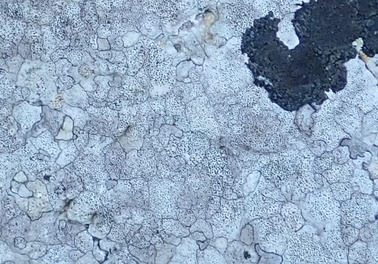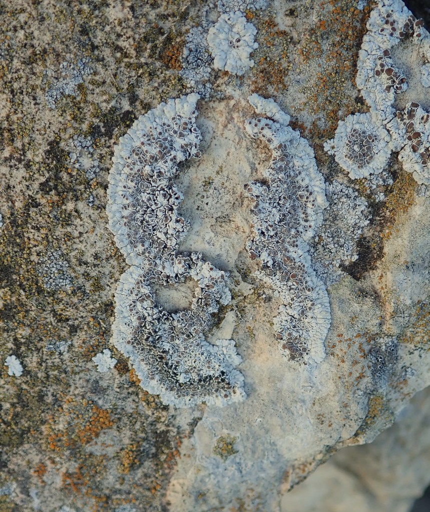 11.- Un altre liquen, pendent d’identificar, però que l’hem volgut mostrar, per la seva particular estructura feta per multitud d’espais separats, talment com si foren divisions dintre d’un mateix territori separades per fronteres. Les parts més fosques corresponen a Verrucaria, un liquen que hem vist abans.