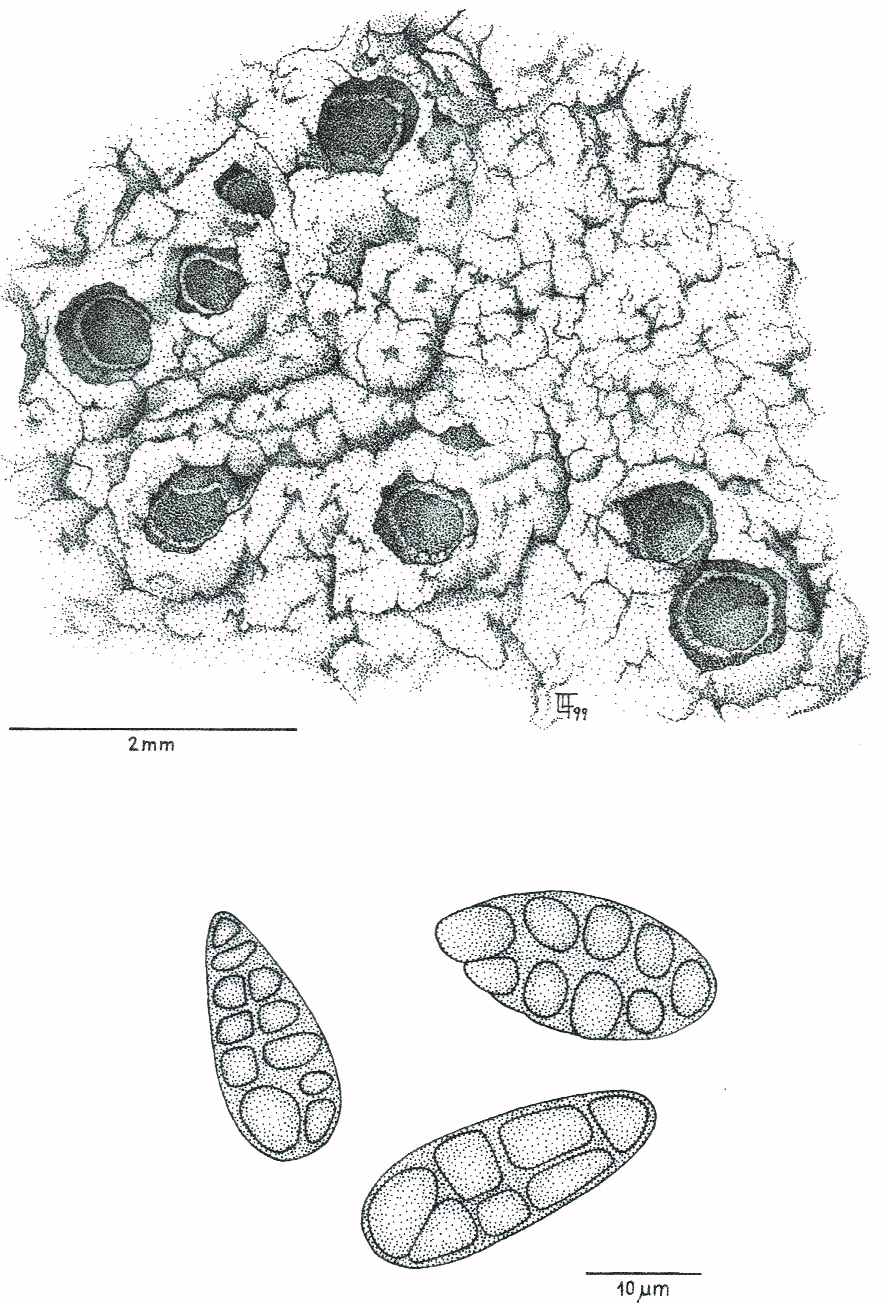 2.- Dibuix original del Dr. Lluís Fiol, tret de la seva tesi doctoral. És el liquen crustaci Diploschistes diacapsis, a la part inferior es representen tres espores, produïdes en els apotecis, més obscurs, de la imatge de dalt.