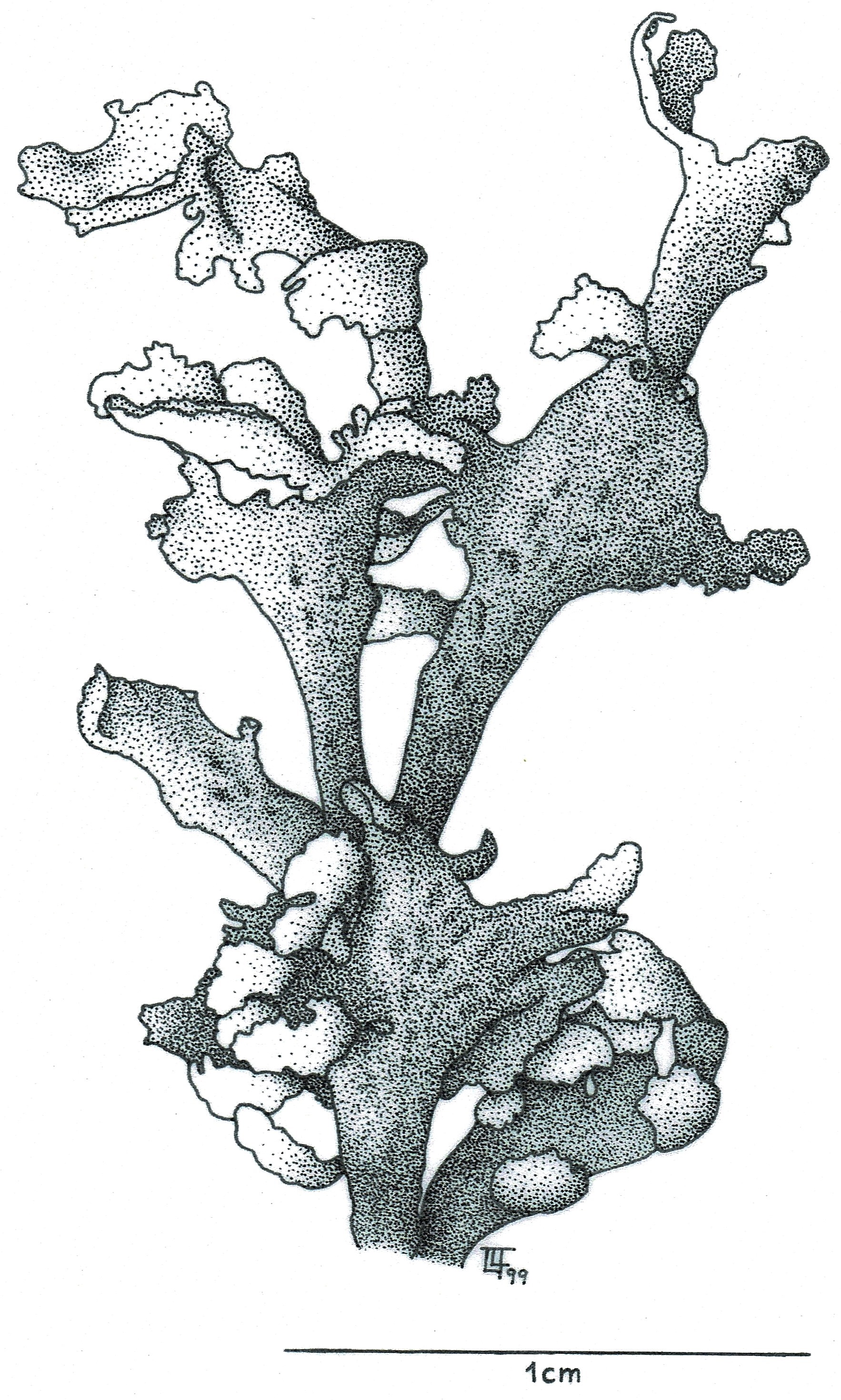 3.- Dibuix original del Dr. Lluís Fiol, tret de la seva tesi doctoral. És el liquen Cladonia cervicornis, viu damunt sòls localment descarbonatats formant gespes, la cara superior és de color verd olivaci i la inferior gris salmó o gris clar.