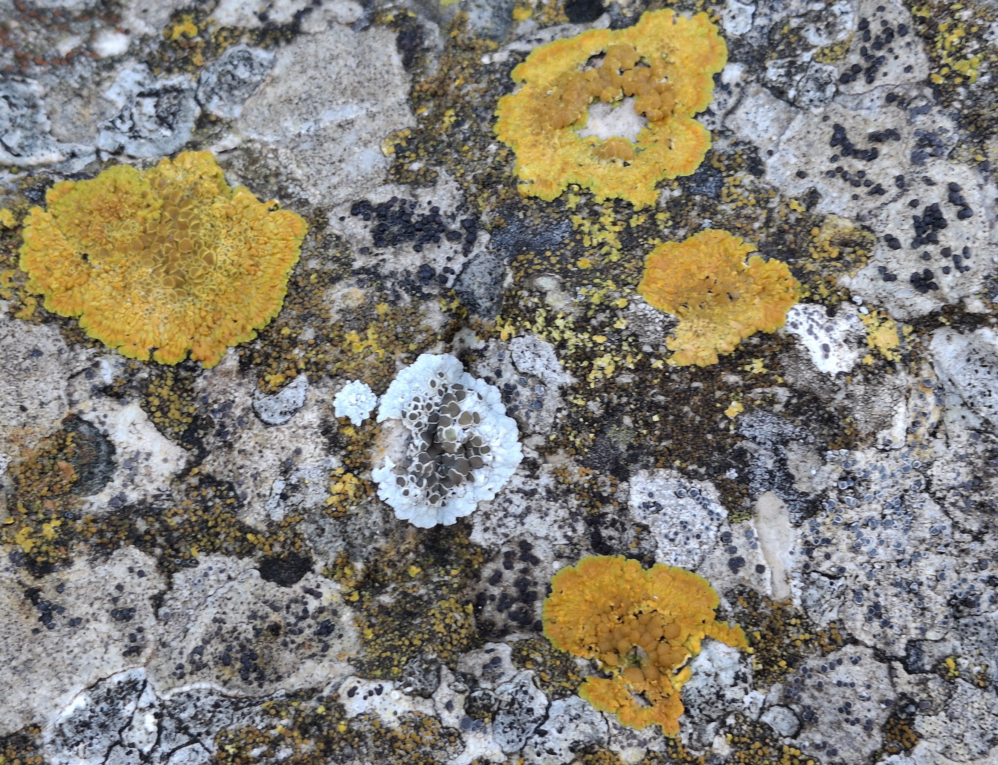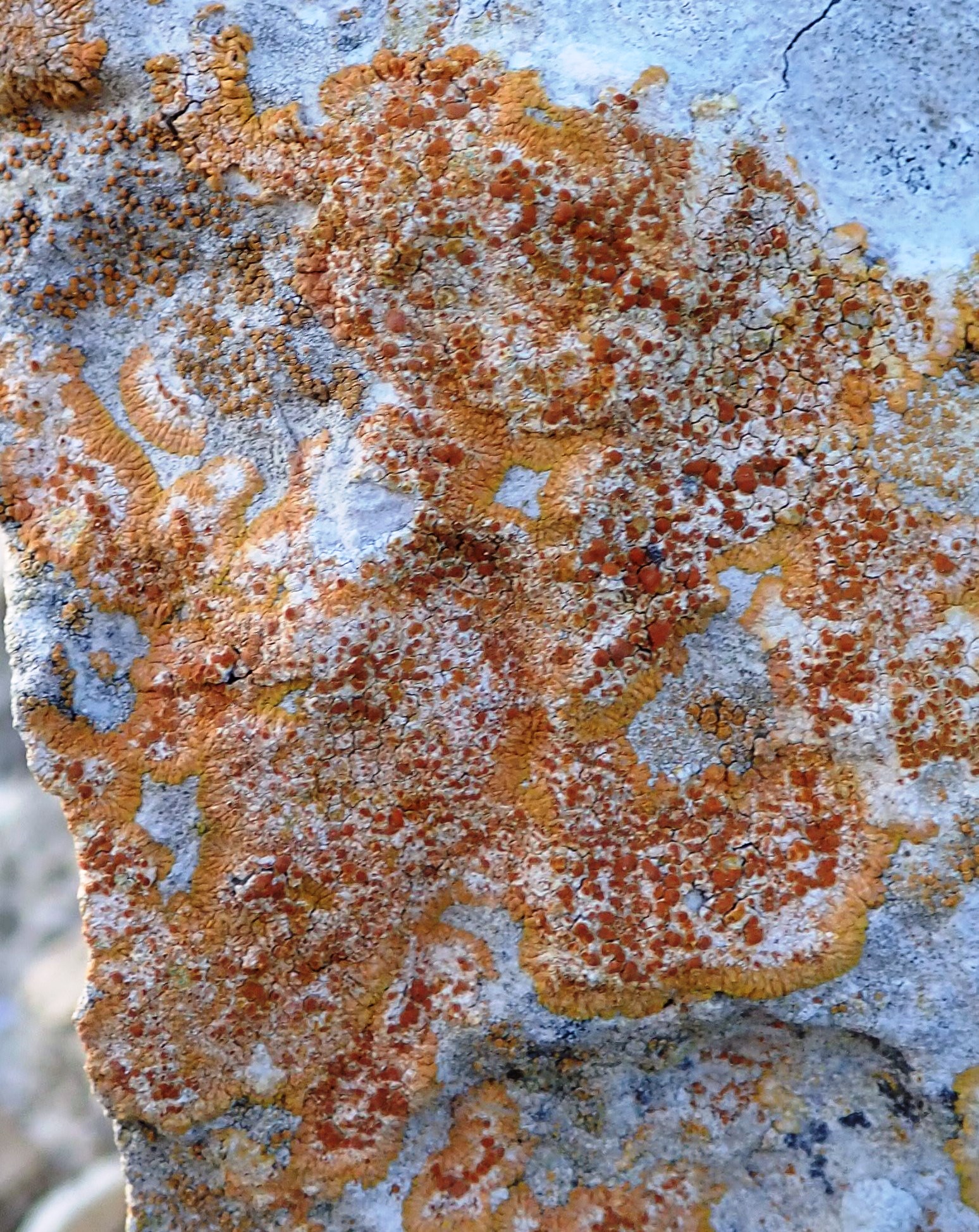 4.- El liquen de color taronja tirant a roig és del gènere Caloplaca, viu sobre roques, és del tipus crustaci, les zones rodones més fosques són els apotecis, llocs on és produeixen les espores en el procés de reproducció sexual.