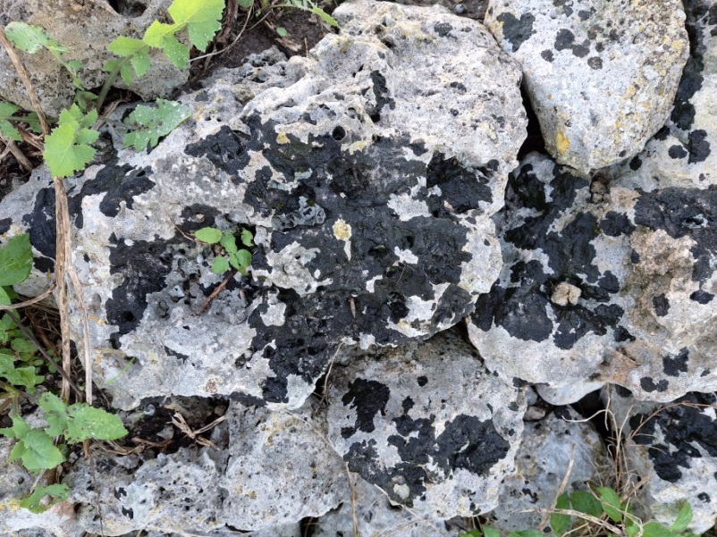 7.- El liquen Verrucaria nigrescens tenyeix les pedres, roques, teules, i altres substrats que colonitza, moltes vegades recobrint grans superfícies, és inevitable topar-hi la vista quan caminam per foravila.