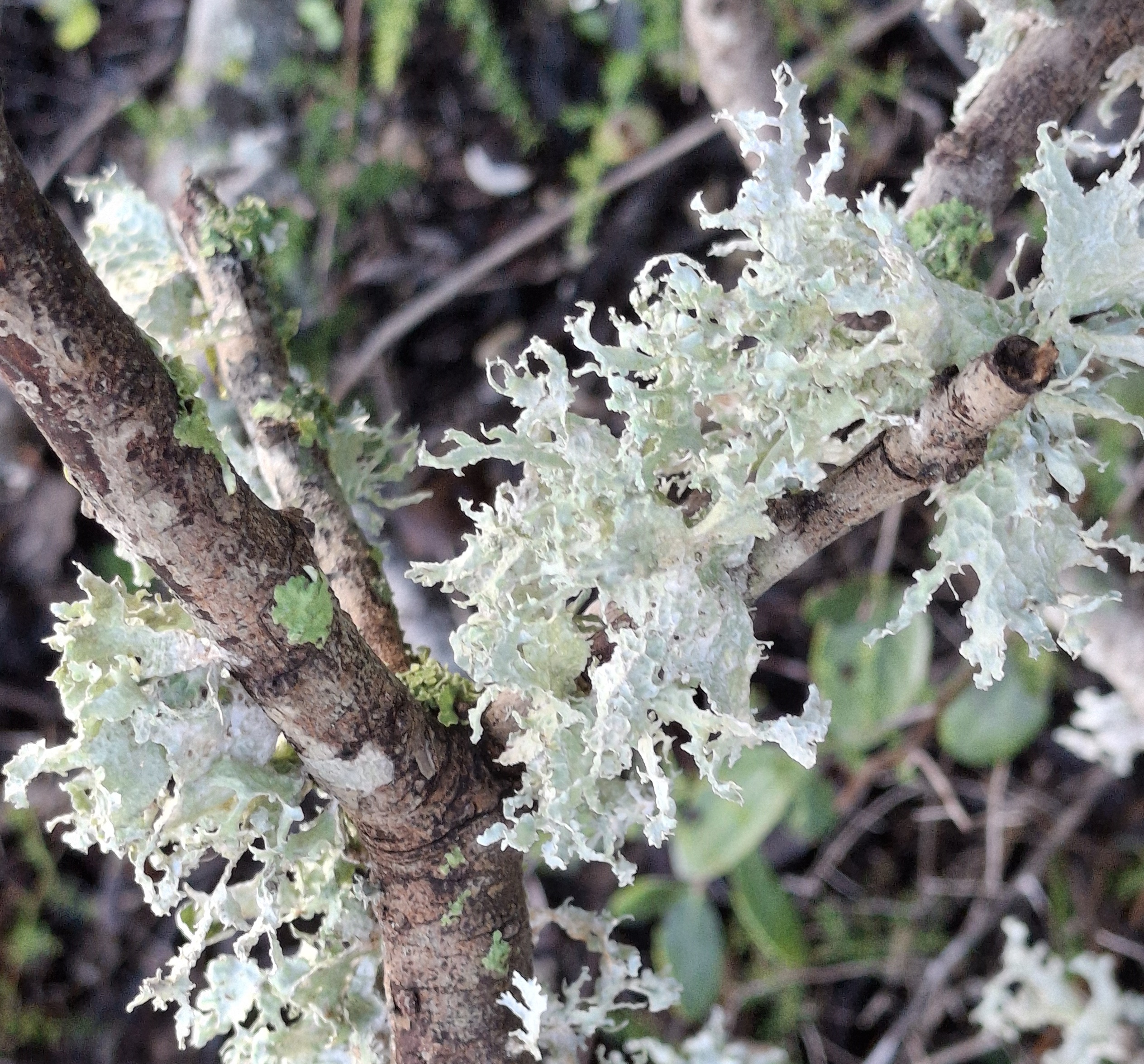 8.- El nom d’aquest liquen és Ramalina canariensis, dins la classificació per l’estructura es considera del grup dels líquens foliacis fruticulosos, la imatge mostra com creix a sobre de les branques d’un arbre.