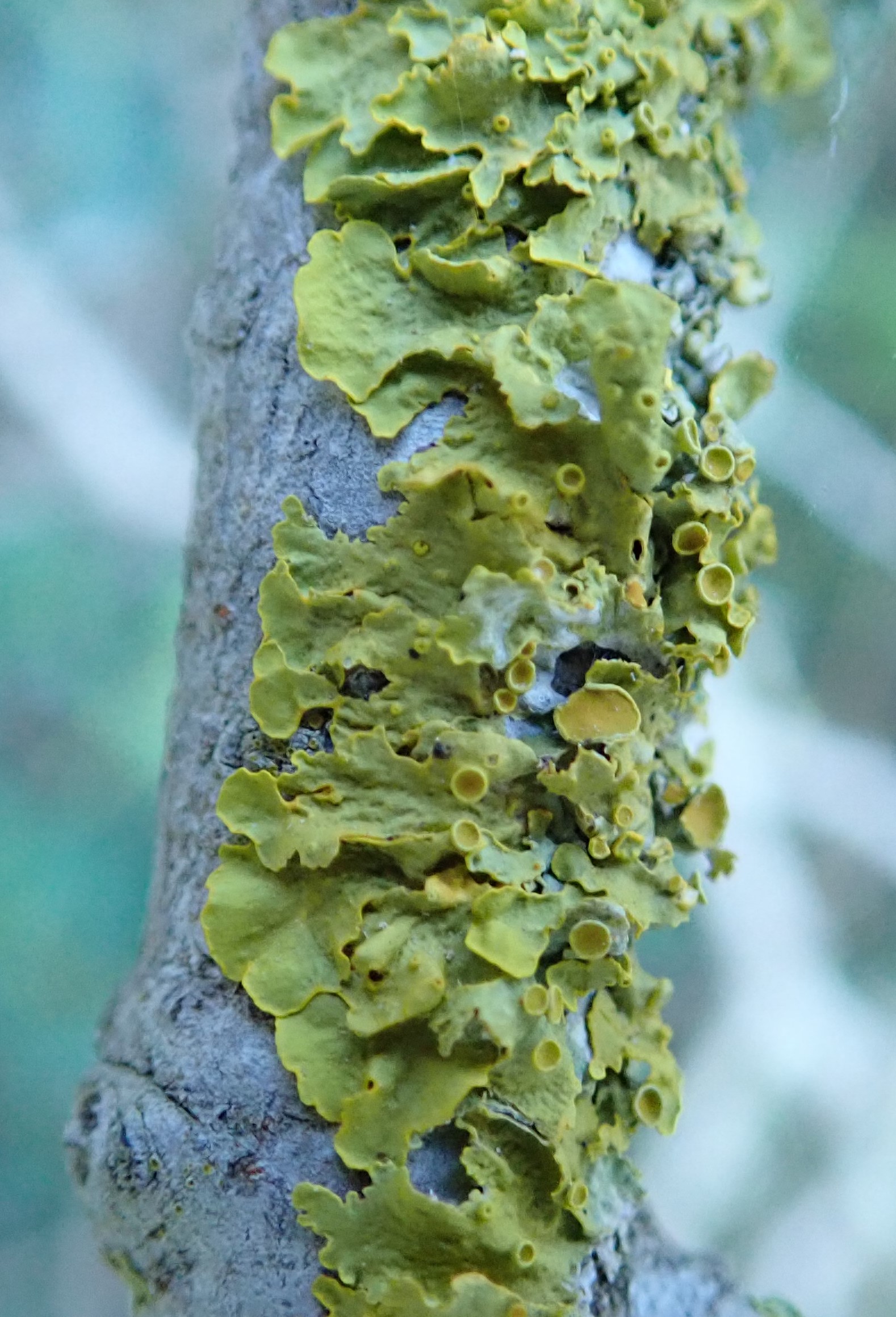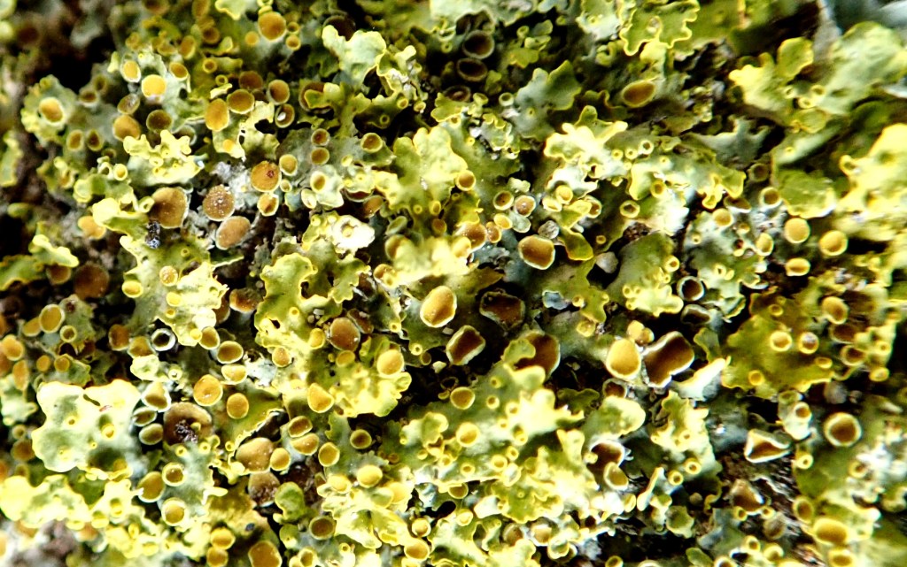 9.- Xanthoria parietina és un liquen amb una àmplia distribució, colonitza les branques dels arbres, les parets, les teulades, i altres llocs. Poden observar-se les petites estructures en forma de platet i de coloració una mica més intensa, són els apotecis, on es produeixen les espores per a la reproducció sexual.