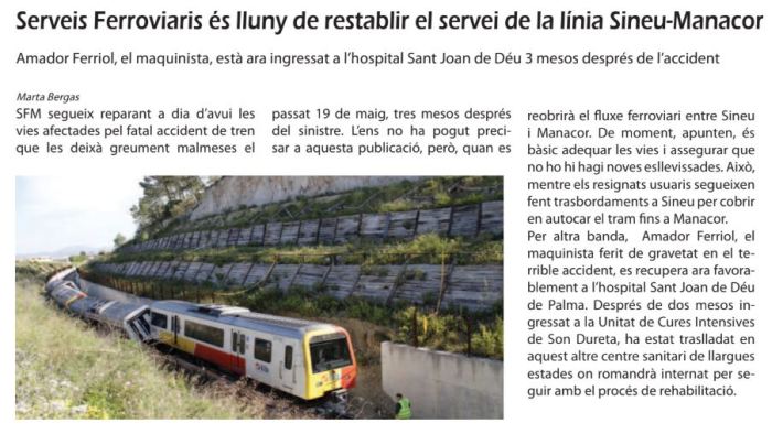 | Diumenge un accident ferroviàri a Còrdova va ocasionar la mort a 42 persones. Ahir mateix un altre accident a Barcelona, en la xarxa de rodalies, va ocasionar la mort d’una persona. És el moment, doncs, de recordar l’accident del 2010 a Sineu. |