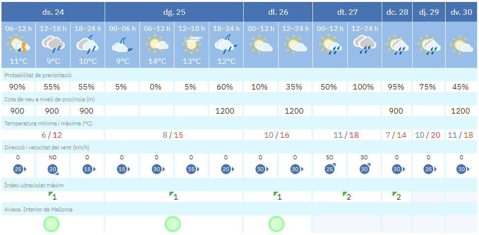 L’AEMET pronostica una probabilitat de precipitació del 55%, tant aquest capvespre, com el vespre. Recordem que el cap de setmana passat la festa de Sant Antoni a Sineu es va ajornar per mal temps (fes clic aquí). A més, pronostica bastant de fred (6 ºC de mínima, en sa nit).