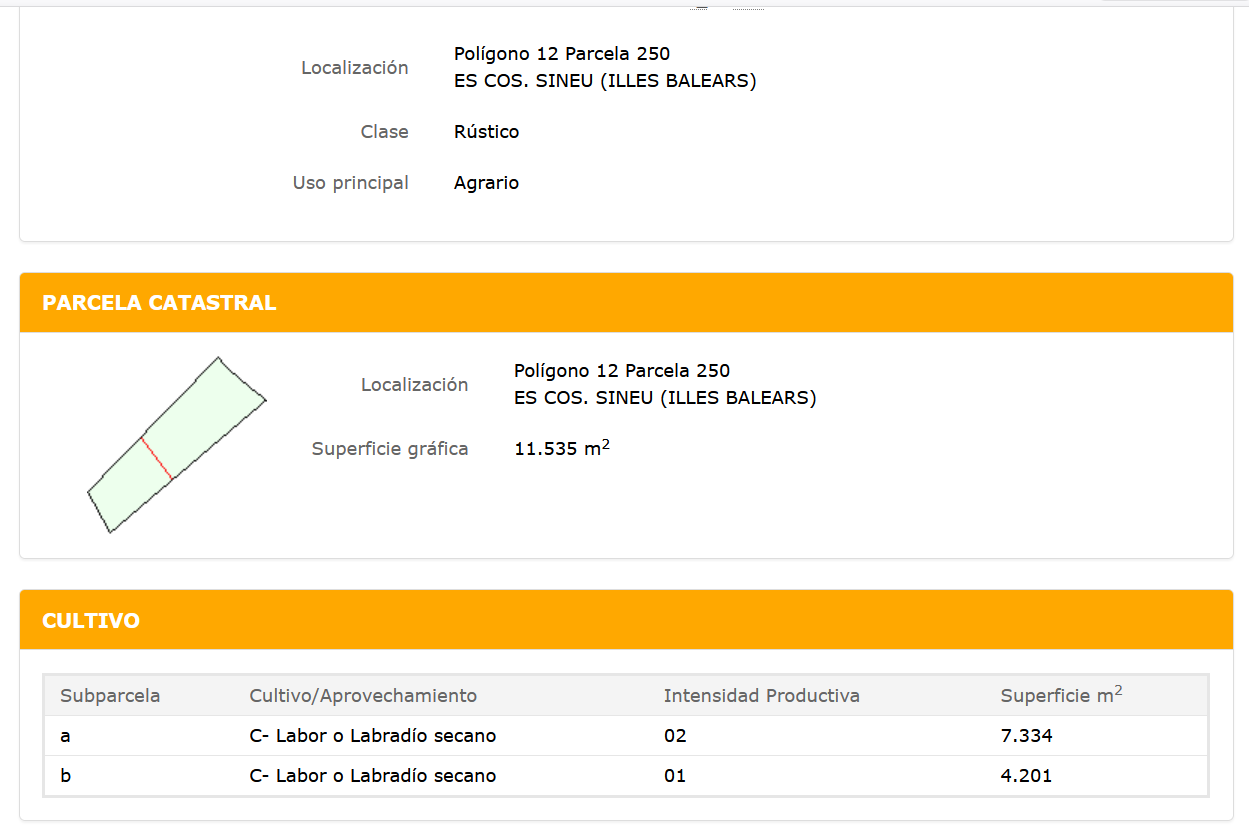 El terreny té una superfície d’11.535 m2, dividit en dues subparcel·les, segons el cadastre. La a) és de 7.334 m2 i la b) de 4.201m2. Si la superfície útil del parc verd és de 2.582 m2, Més per Sineu es demana perquè s’ha de comprar tota la parcel·la i considera que bastaria adquirir la subparcel·la b) que arriba a la carretera. Més per Sineu es demana què més hi vol fer l’equip de govern als 9.000 m2 restants.
