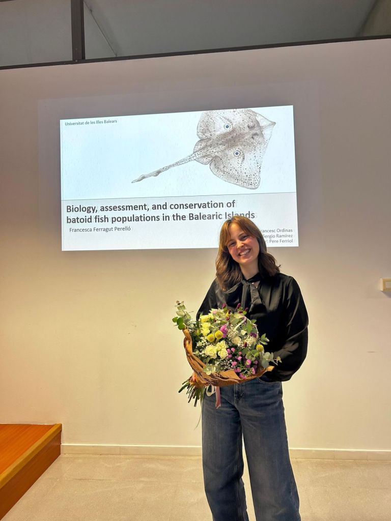 El passat divendres 6 de març la sineuera Xisca Ferragut Perelló va defensar, a la UIB i dins el Programa en Ecologia Marina, la tesi doctoral titulada: Biology, Assessment, and Conservation of Batoid Fish populations in the Balearic Island, amb què va assolir la màxima puntuació d’excel·lent cum laude. Com queda palès en el títol de la tesi, aquesta està redactada en anglès, llengua obligatòria perquè les publicacions científiques siguin avaluades i valorades internacionalment, i també va fer-hi la defensa. De forma molt general i resumida, les investigacions per a la tesi s’han centrat en els peixos coneguts científicament com elasmobranquis -un grup de peixos cartilaginosos- que inclou els taurons i les rajades, aquestes darreres són els batoïdeus que ha estudiat amb més detall na Xisca. Amb quin objectiu? Doncs, com molt bé diu al resum de la tesi, per generar una base de coneixement científic que permeti fonamentar mesures per assegurar la conservació de les espècies vulnerables a l’arxipèlag balear. La novella doctora Ferragut destaca, en base als resultats obtinguts, la necessitat de continuar amb el seguiment i l’aplicació de mesures de gestió específiques.