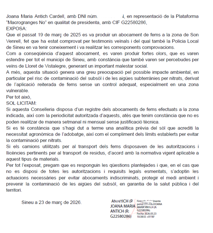 Aquesta és la queixa formal que la Plataforma “Macrogranges No”, a través de la seva presidenta, ha fet arribar a la Conselleria d’Agricultura, Pesca i Medi Natural sobre l’olor que la setmana passada es va estendre, des de la finca de Son Venrell, per tot el municipi de Sineu, amb constància que també va ser percebuda per veïns de Lloret de Vistalegre, generant un important malestar social:
