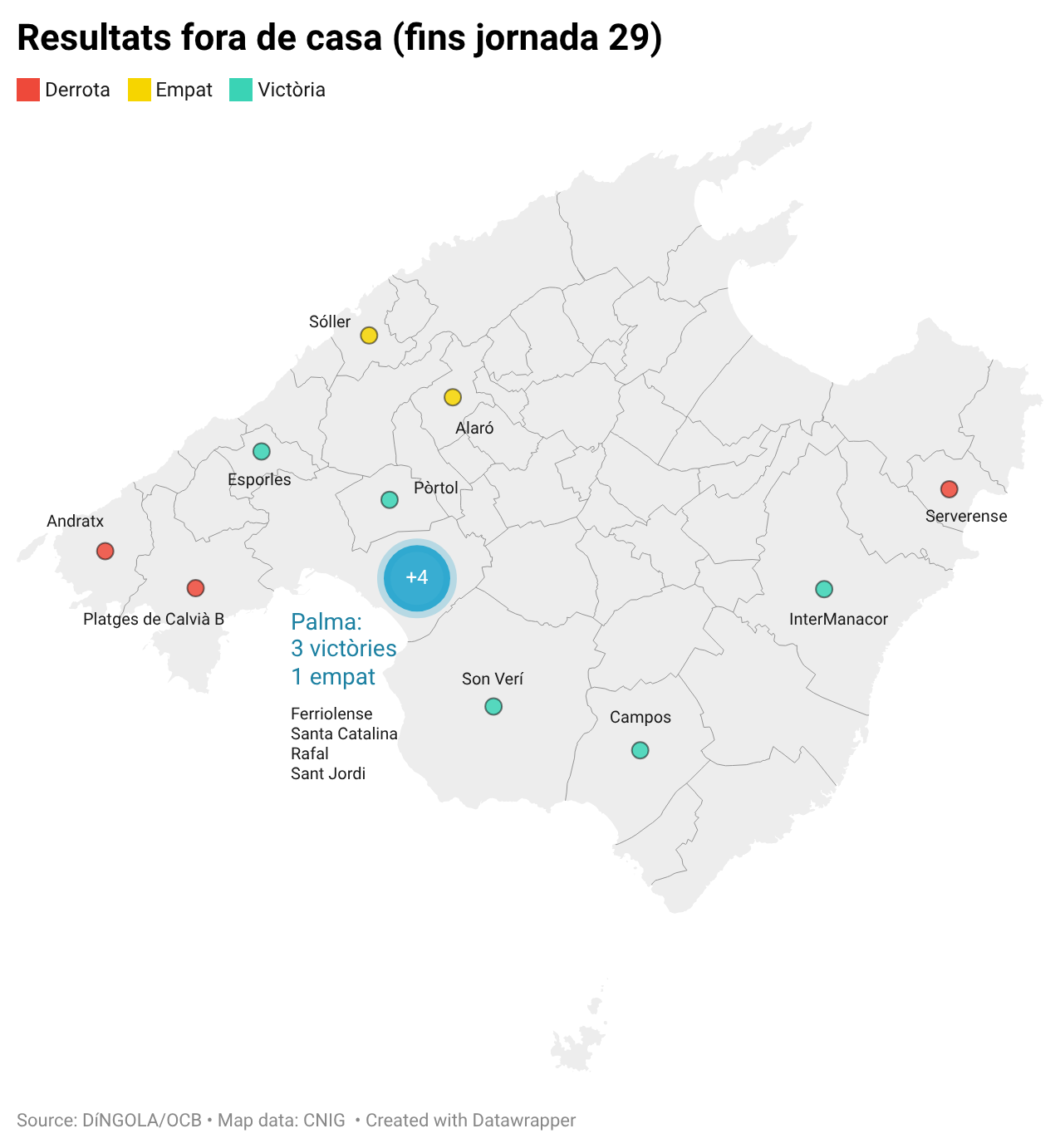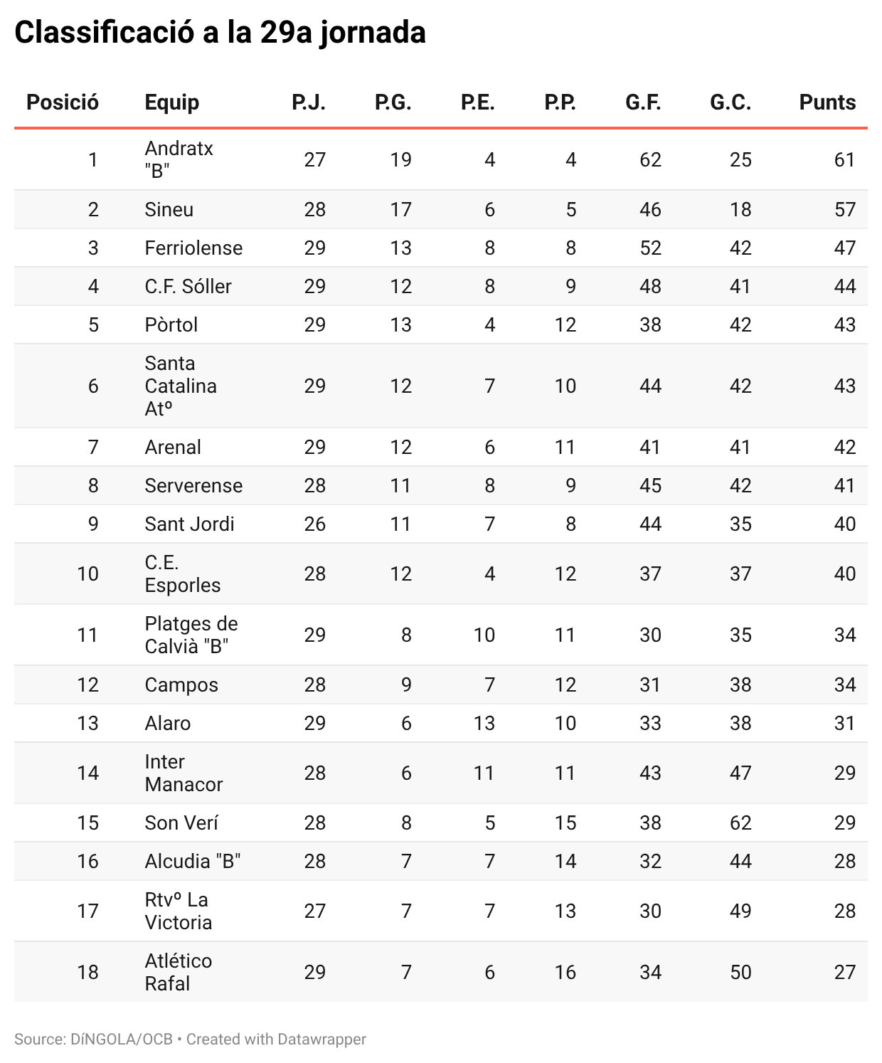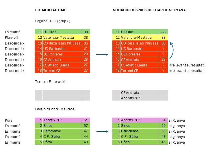 Aquest diumenge l’Andratx de 2a divisió RFEF, en 16a posició i 28 punts, s’enfronta a l’Alcoyano (4t classificat). Queden tres partits (9 punts en joc). A 3a divisió, a partir de la 13a posició baixen automàticament. Si diumenge l’Andratx perd o empata, doncs, és impossible que en les dues jornades que quedaran superi al CD Ibiza Islas Pitiusas, ara amb 36 punts i 13a posició.
