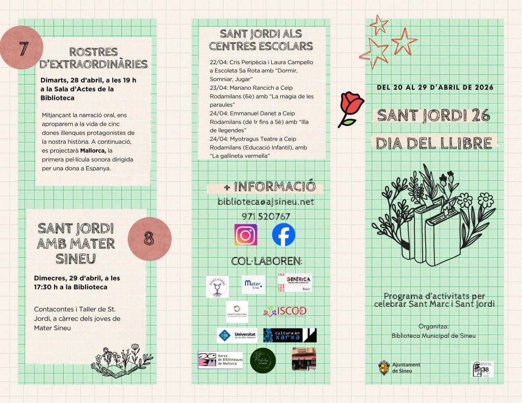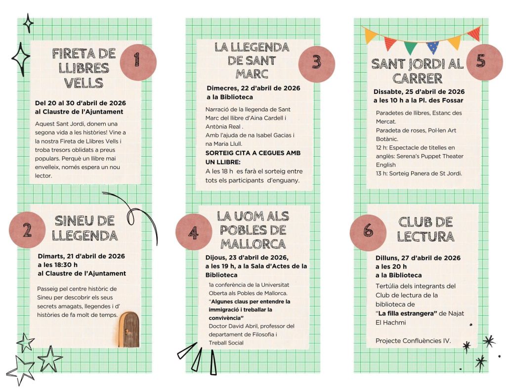 La literatura i la reflexió també hi tenen un paper central. El 23 d’abril, coincidint amb el dia gran, tendrà lloc una conferència dins el cicle Universitat Oberta als Pobles de Mallorca, que abordarà temes socials contemporanis. A més, el Club de Lectura de la biblioteca oferirà una tertúlia literària al voltant de l’obra La filla estrangera de Najat El Hachmi.