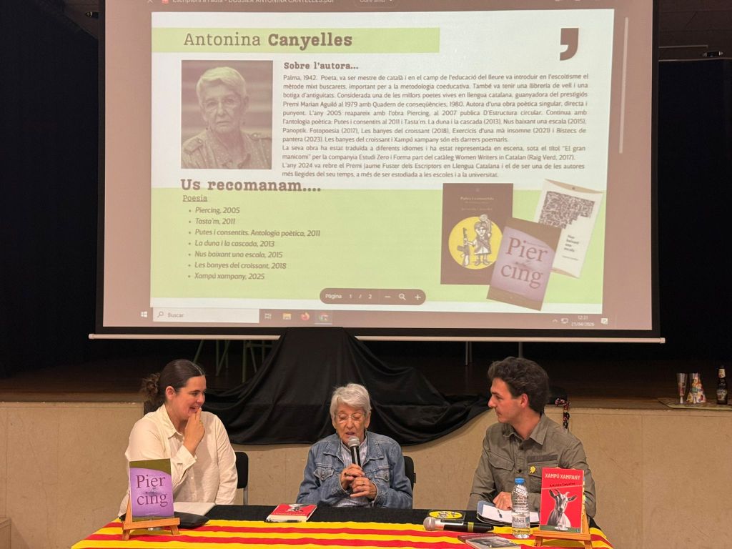 Una de les propostes més destacades ha estat la visita de la poetessa mallorquina Antonina Canyelles (Palma, 15 de setembre de 1942), que ha ofert una xerrada a l’alumnat de 1r de Batxillerat sobre la seva trajectòria i la seva obra. Prèviament l’alumnat havia treballat alguns dels seus poemes a classe i, com a resultat d’aquest treball, han creat un poema objecte que actualment es pot veure exposat al vestíbul del centre.