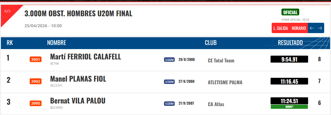 Dissabte es va disputar el Campionat de Balears Sub20 dels 3.000 metres obstacles a la pista d’atletisme del Centre de Tecnificació Esportiva de les Illes Balears, a Palma.